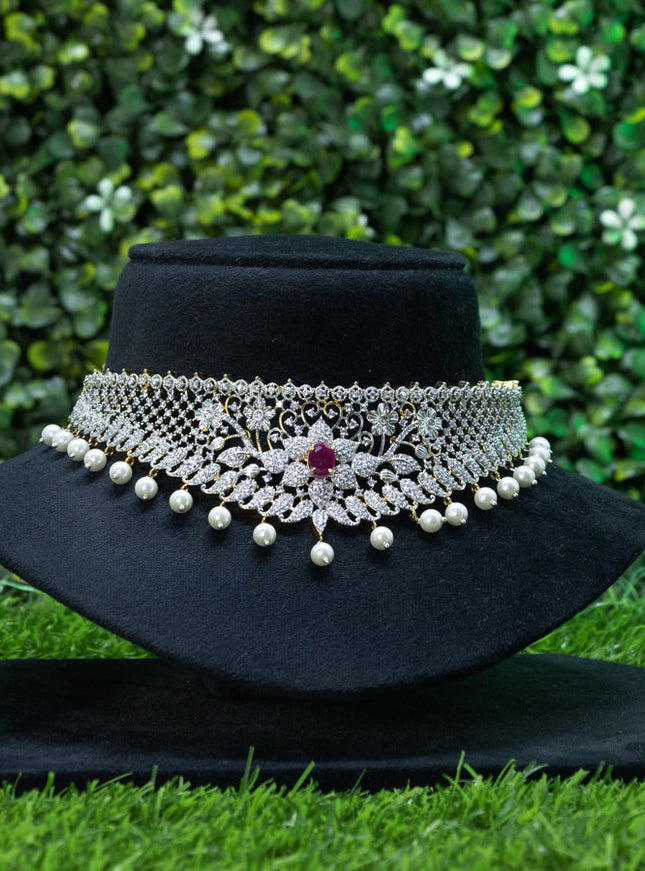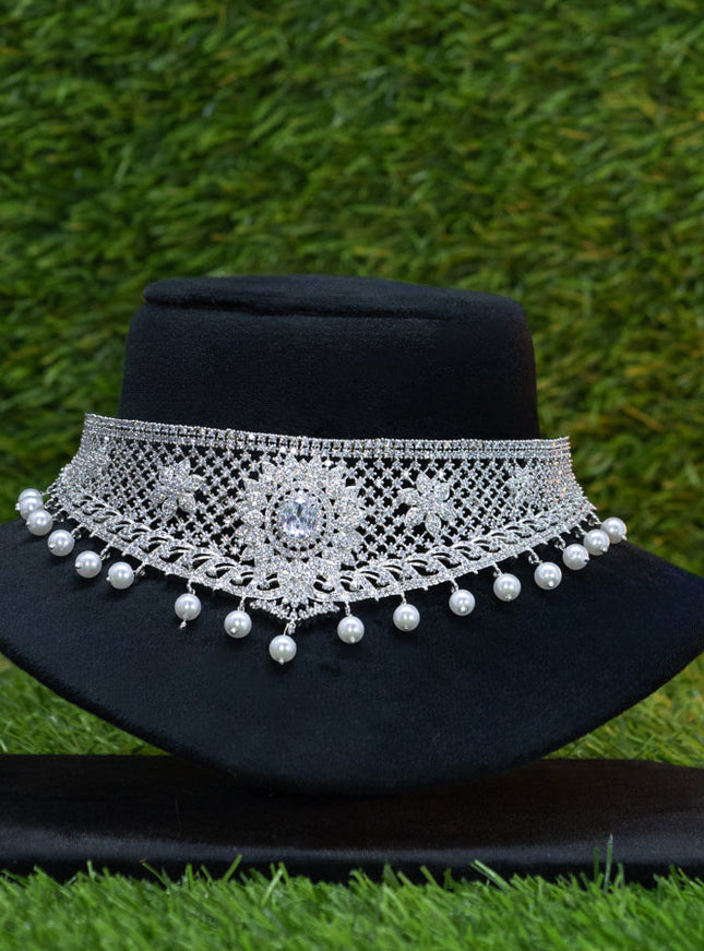 10% OFF Zircon choker floral design with saphire & cz stones and pearl hangings without earrings