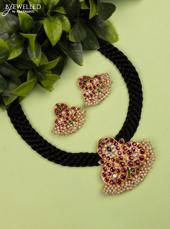 10% OFF Black thread floral design necklace with kemp stone and pearl hangings without earrings