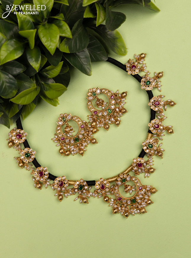 10% OFF Black thread necklace manga pattern with kemp & kundan stones and pearl hangings