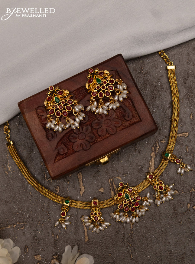 10% OFF Antique attigai necklace peacock design with kemp stones and pearl hanging without earring
