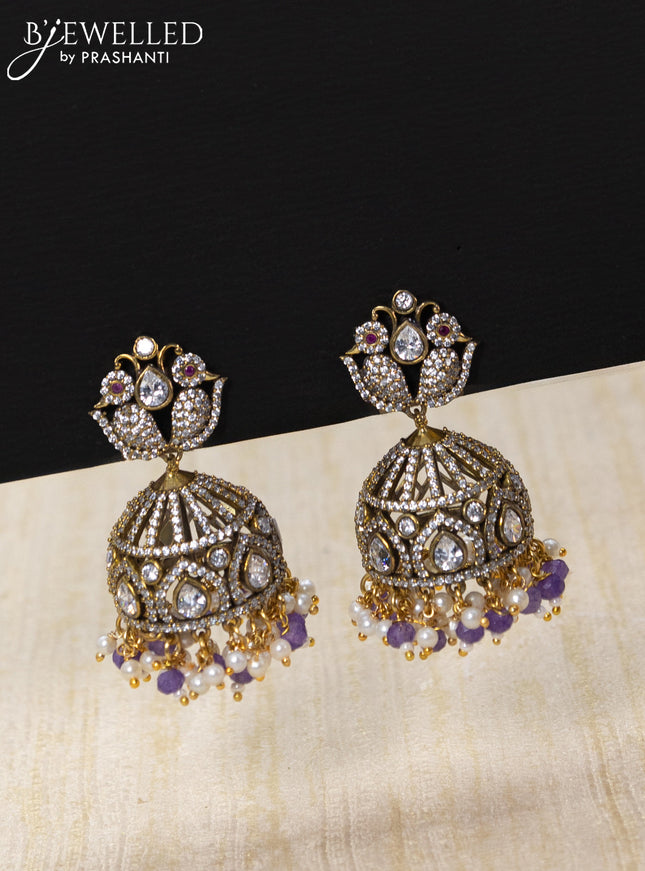 10% OFF Beaded multilayer violet necklace peacock design with kundan & cz stones and pearl & beads hanging in victorian finish Beaded multilayer violet necklace peacock design with kundan & cz stones and pearl & beads hanging in victorian finish