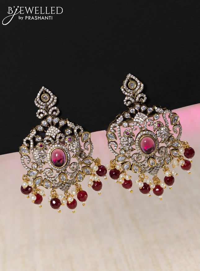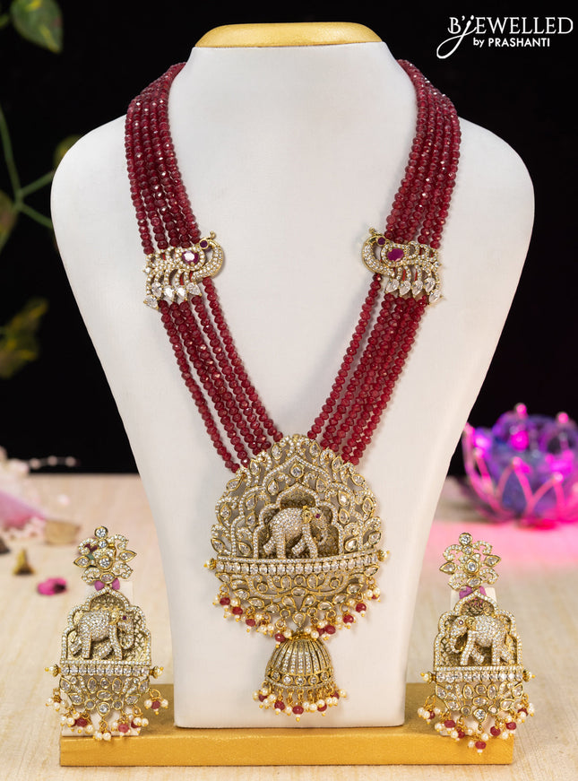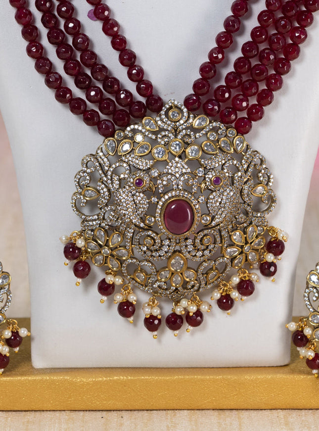 10% OFF Beaded maroon necklace peacock design with ruby & cz stones and pearl & beads hanging in victorian finish Beaded maroon necklace peacock design with ruby & cz stones and pearl & beads hanging in victorian finish