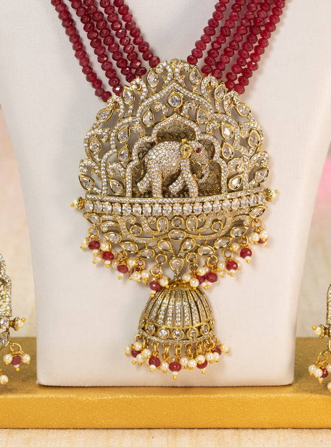 10% OFF Beaded multilayer maroon necklace peacock design with ruby kundan & cz stones and pearl & beads hanging in victorian finish Beaded multilayer maroon necklace peacock design with ruby kundan & cz stones and pearl & beads hanging in victorian finish