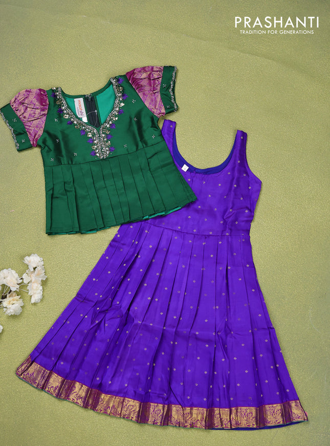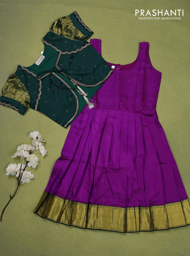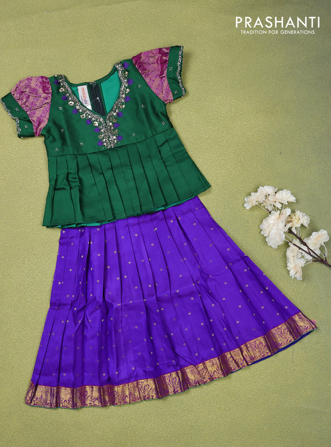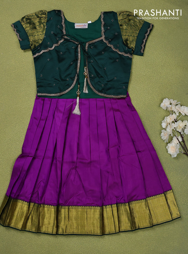 Pure silk kids lehenga dark green and purple wi...