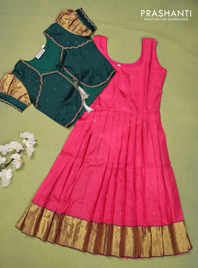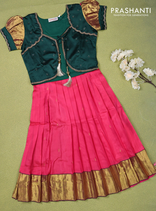 Pure silk kids lehenga bottle green and pink wi...