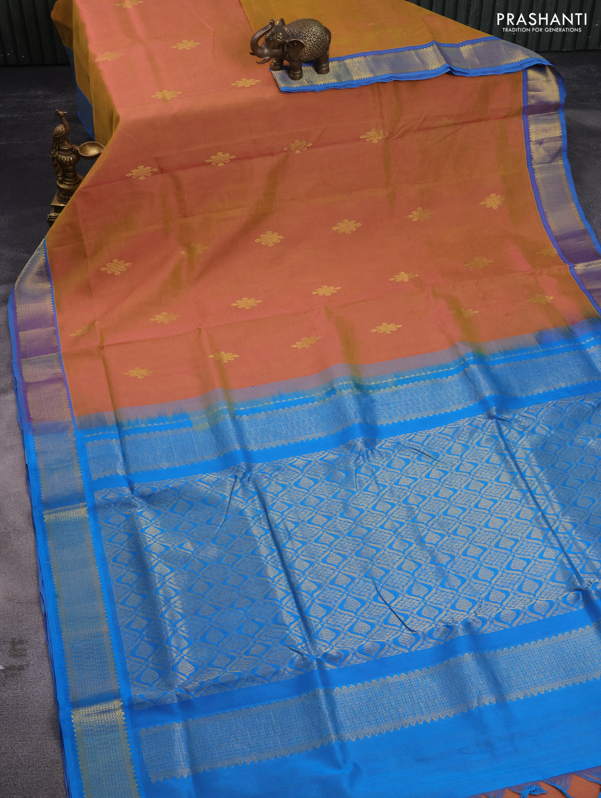 10 yards silk cotton saree dual shade of mustard and cs blue with zari woven buttas and zari woven border