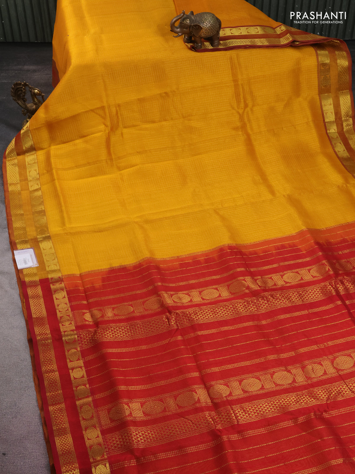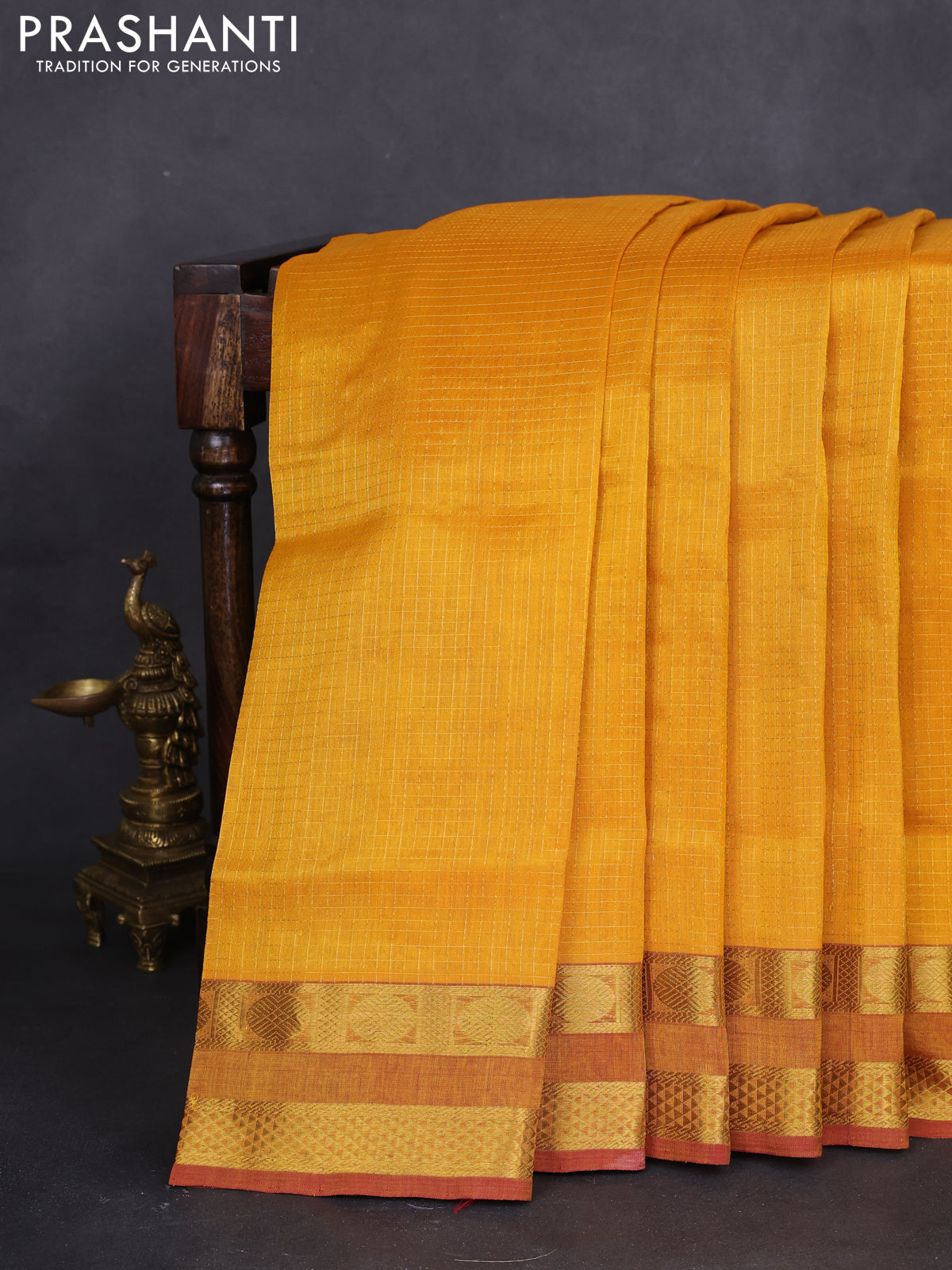10 yards silk cotton saree mango yellow and maroon with allover small zari checks and rettapet zari woven border