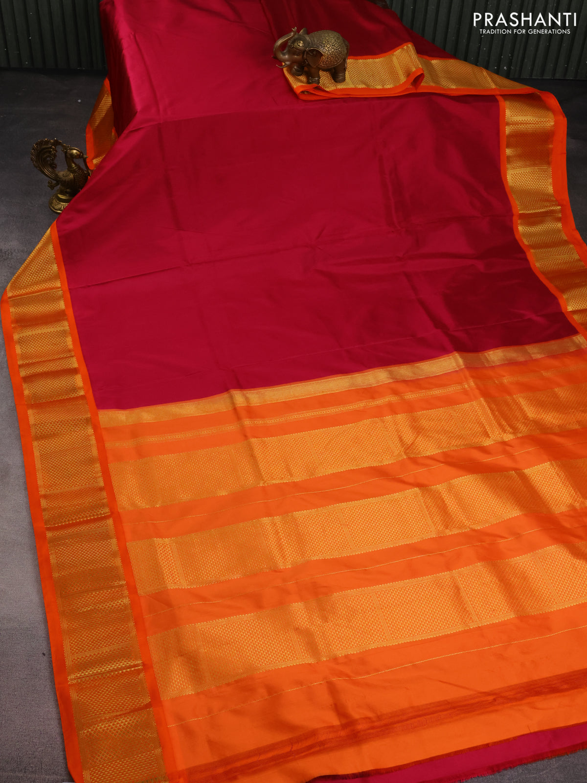 10 Yards silk saree magenta pink and orange with plain body and zari woven border
