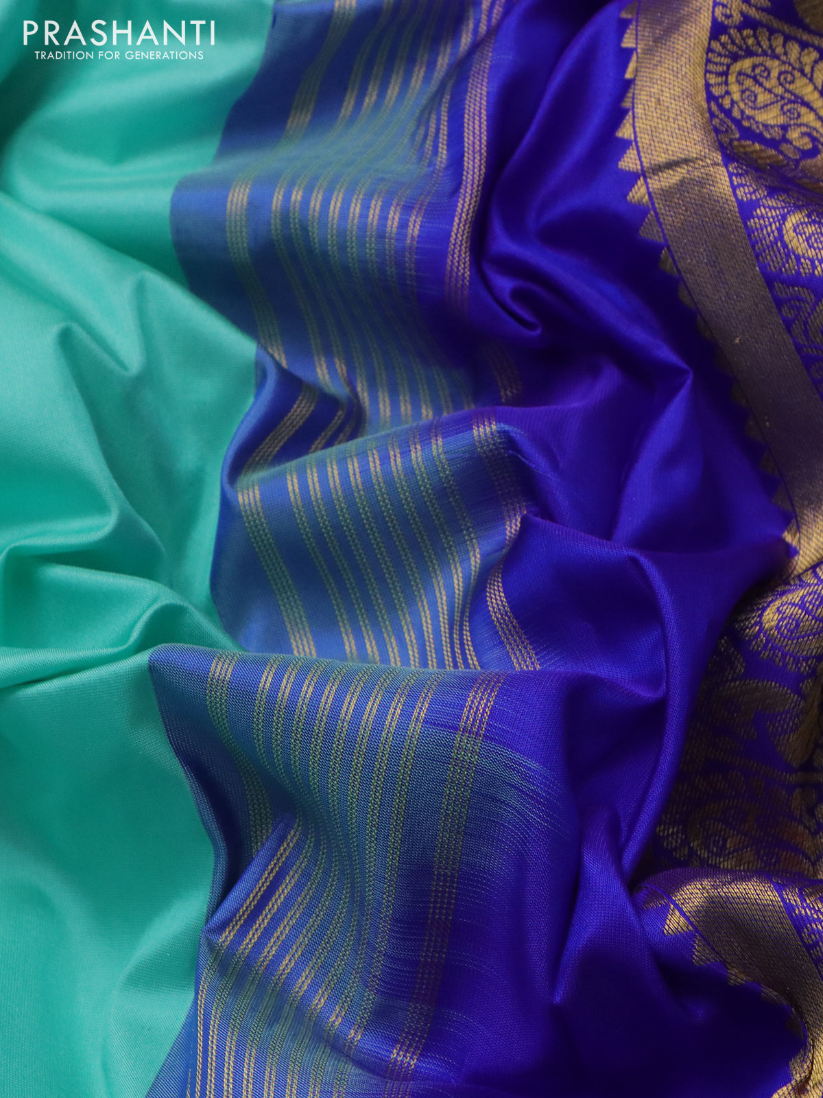 10 yards silk saree teal blue and blue with plain body and temple design annam zari woven border
