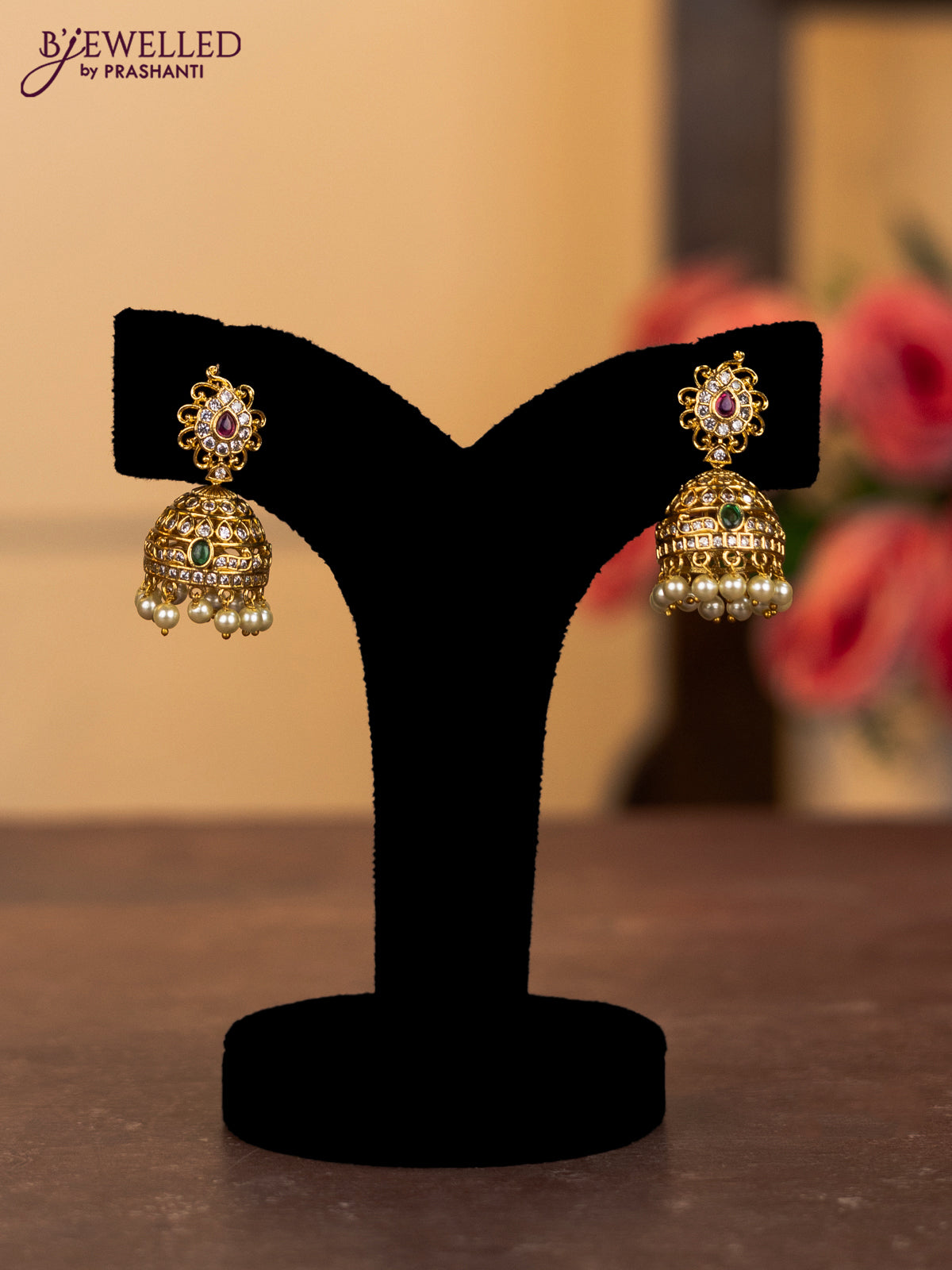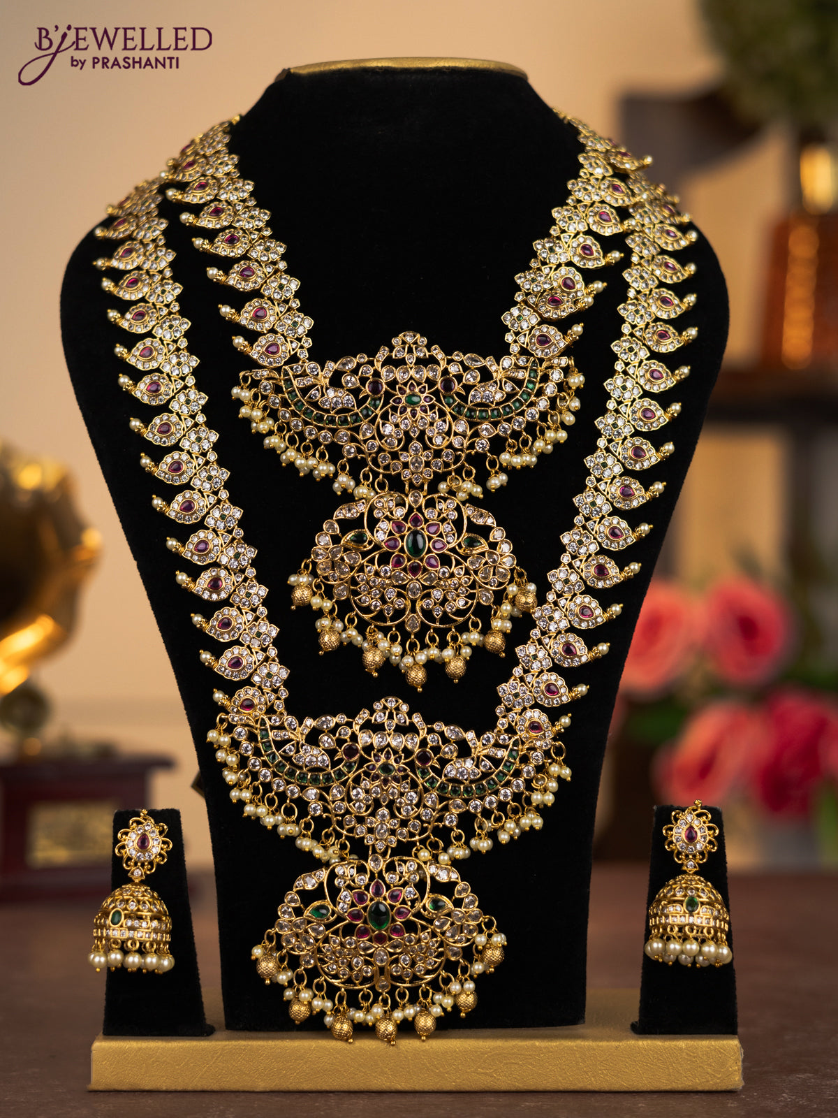 Antique combo set manga pattern with kemp & cz stones and pearl & golden beads hangings