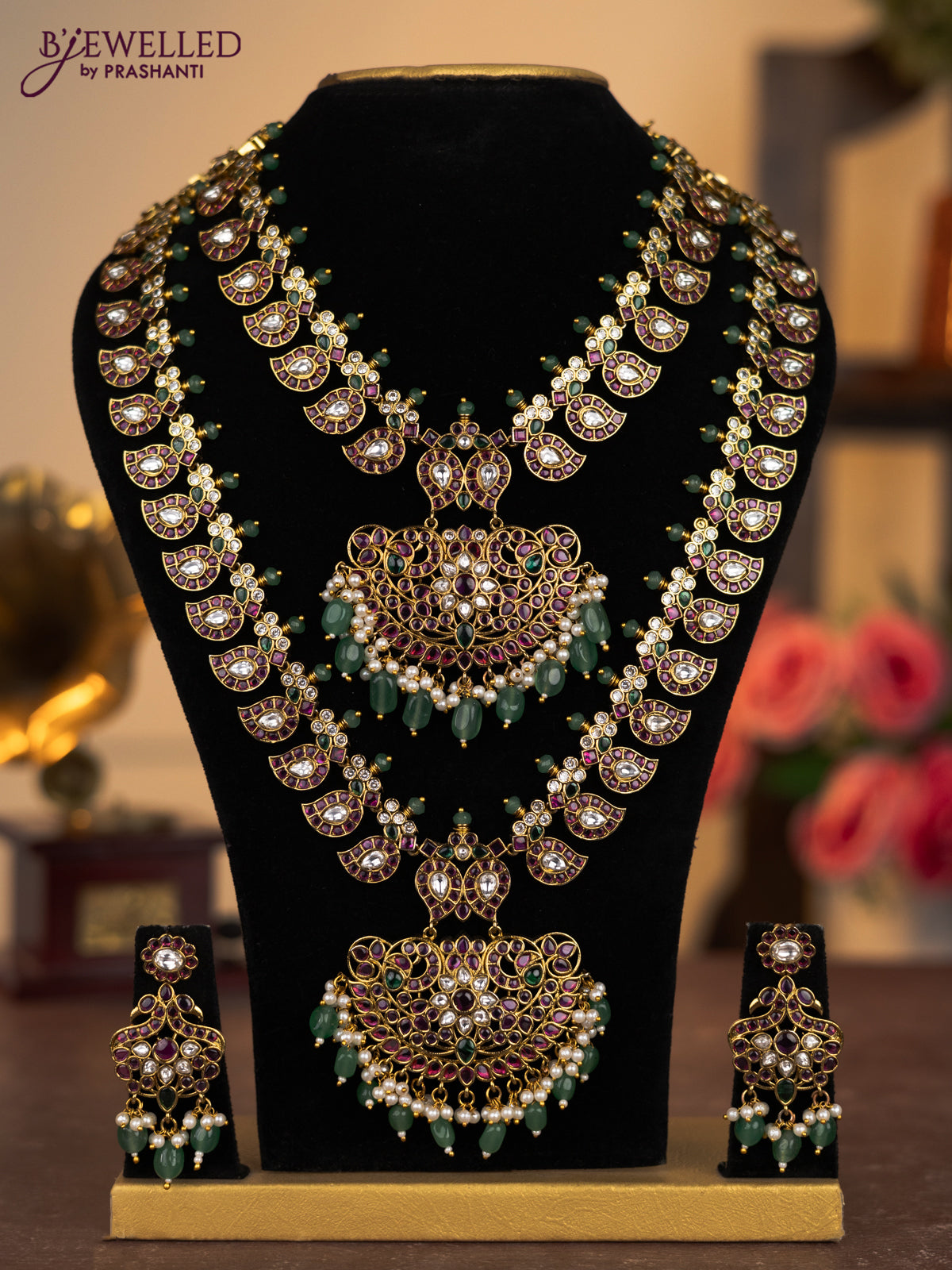 Antique combo set manga pattern with kemp & kundan stones and pearl & green beads hangings
