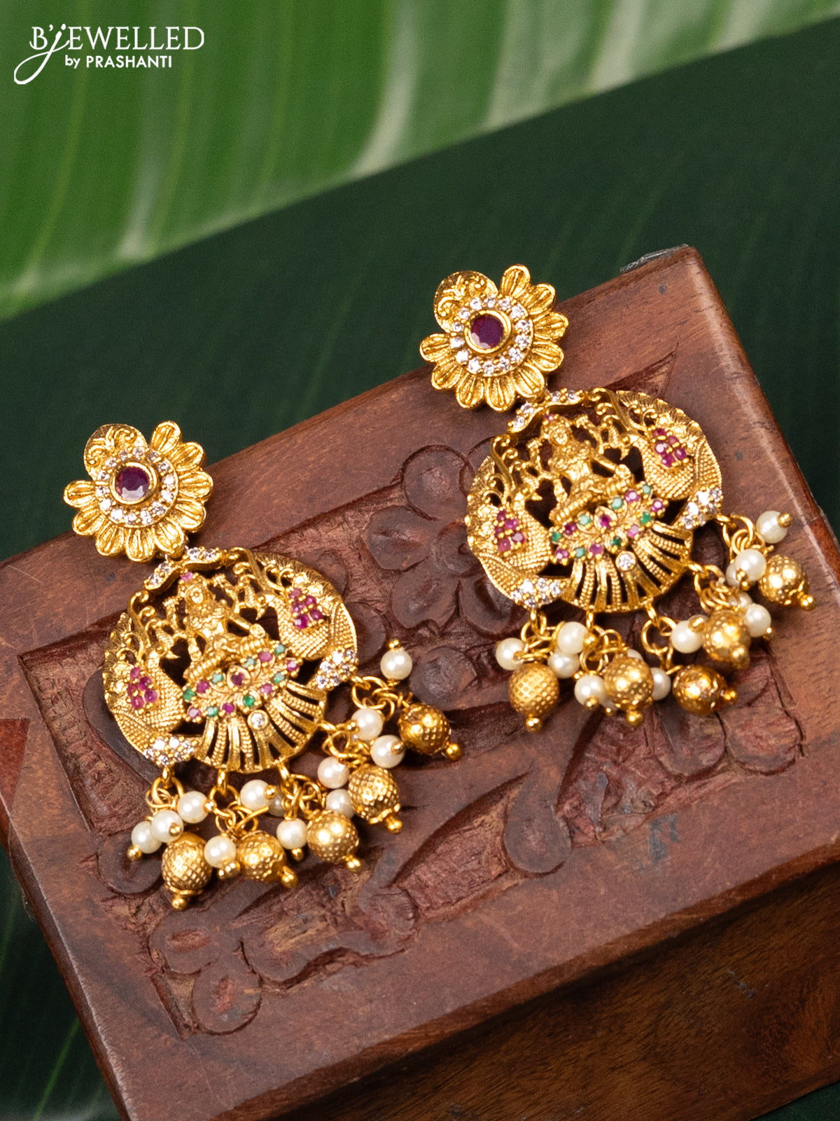 Antique earring lakshmi design with kemp & cz stones and pearl hangings