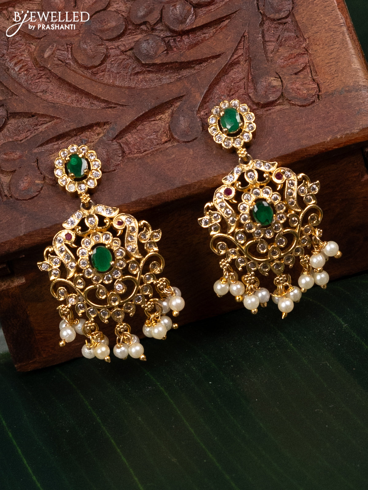 Antique earring peacock design with emerald & cz stones and pearl hangings