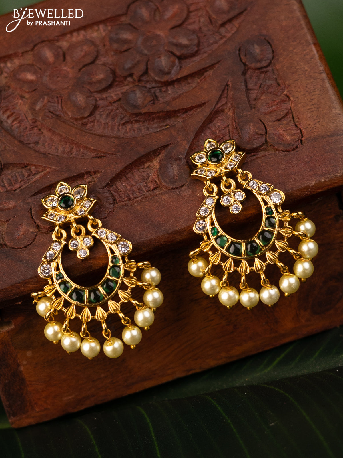 Antique earrings chandbali design with green kemp & cz stones and pearl hangings