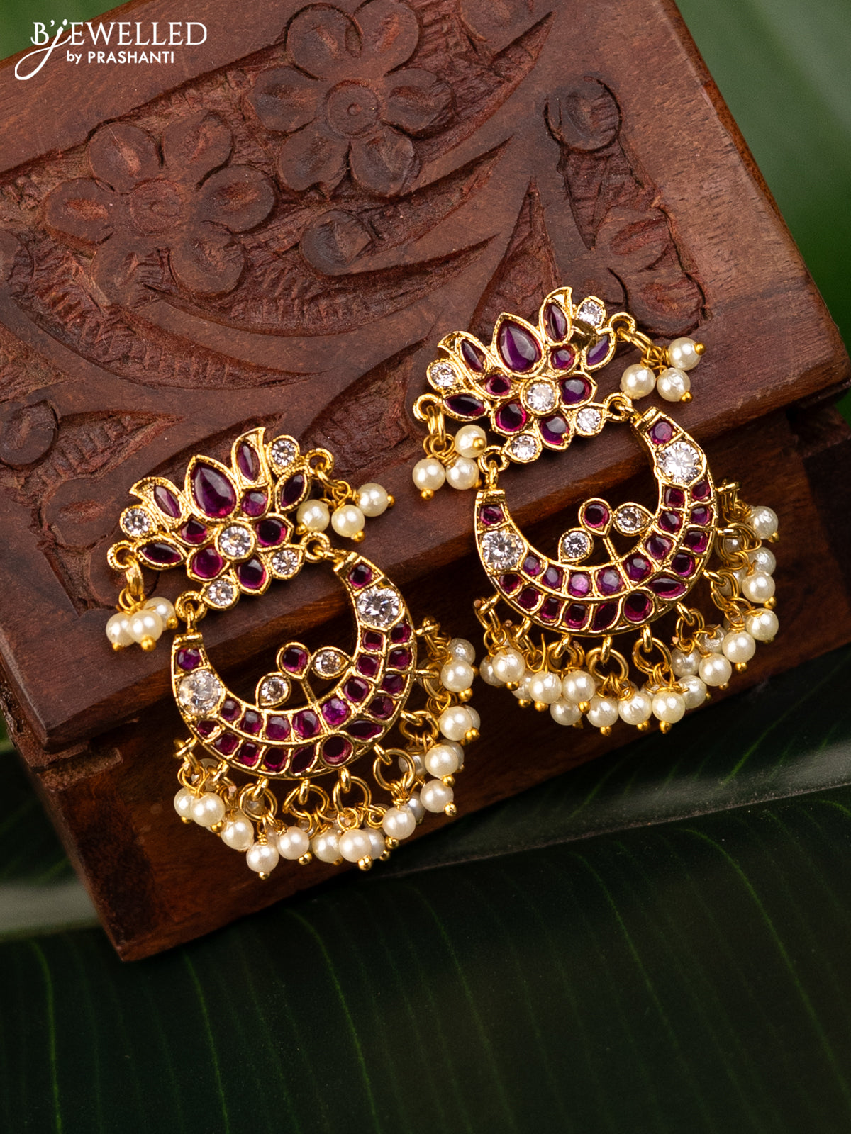 Antique earrings chandbali design with pink kemp & cz stones and pearl hangings