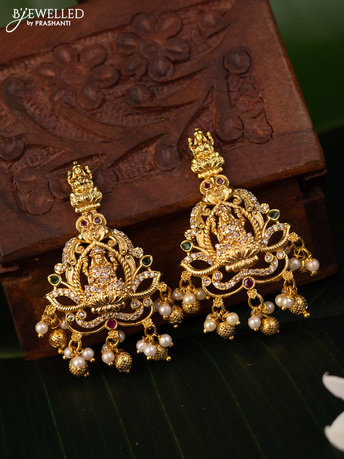 Antique earrings lakshmi design with kemp & cz stones and golden beads hanging