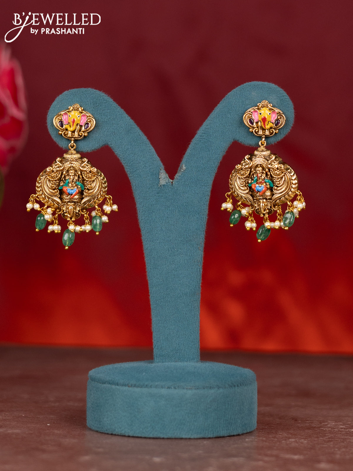Antique enamel ganesha pendant haram with kemp stones and green beads & pearl hanging
