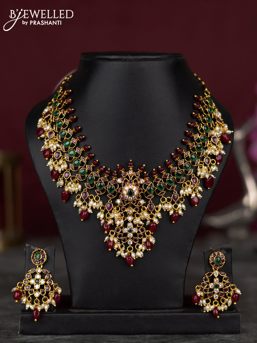 Antique guttapusalu necklace changable pendant with kemp & cz stones and pearl & pink beads hangings