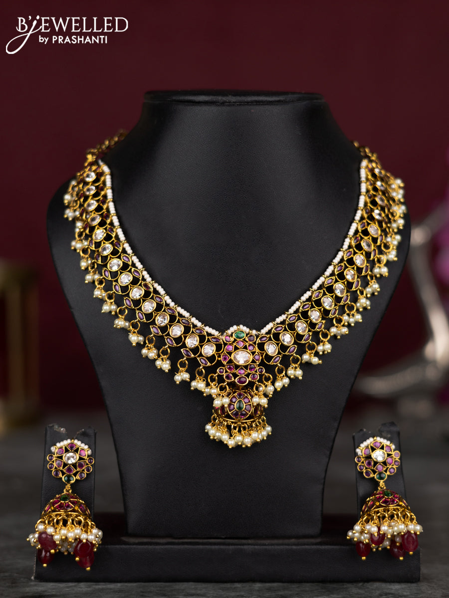 Antique guttapusalu necklace changable pendant with kemp & cz stones and pearl & pink beads hangings