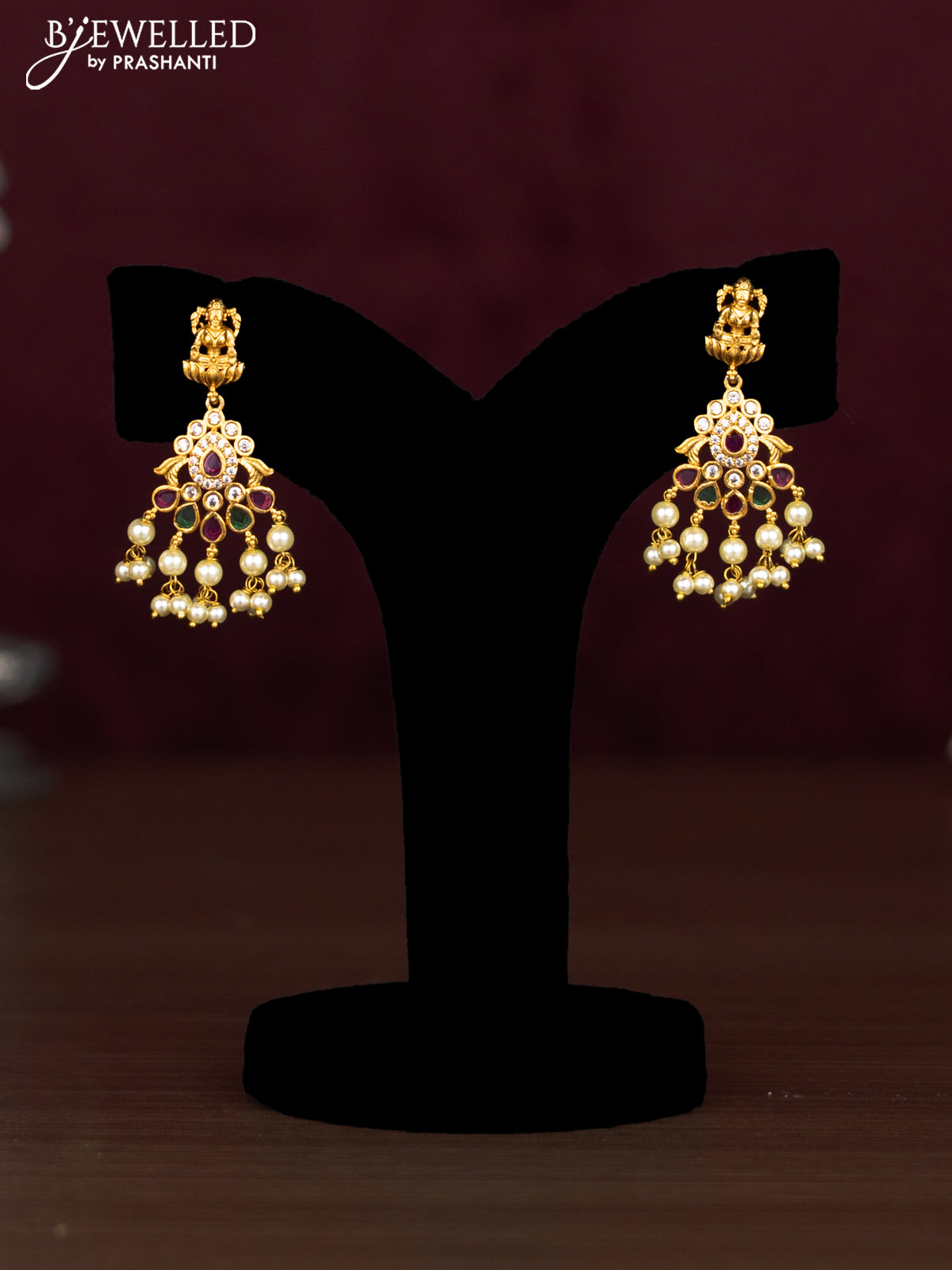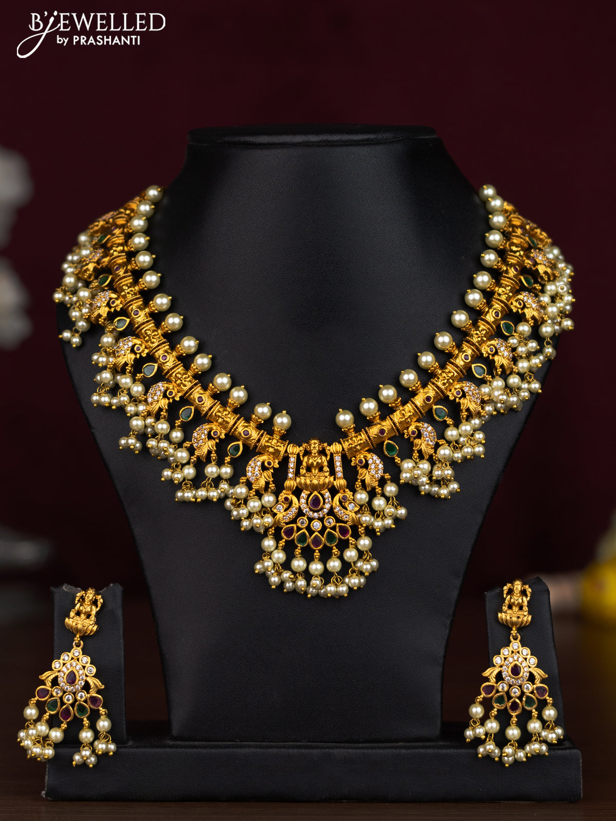 Antique guttapusalu necklace lakshmi & peacock design with kemp & cz stones and pearl hangings