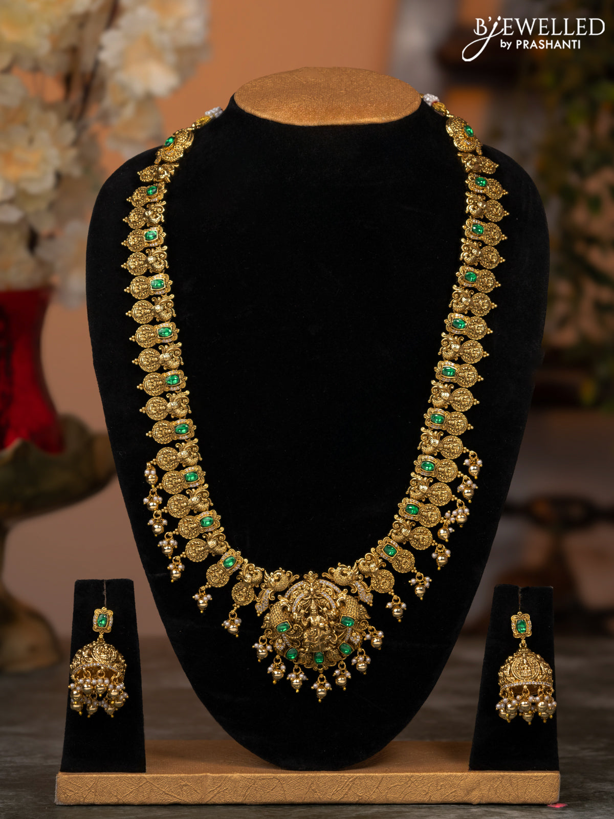 Antique haaram lakshmi design with emerald & cz stones and golden beads hangings