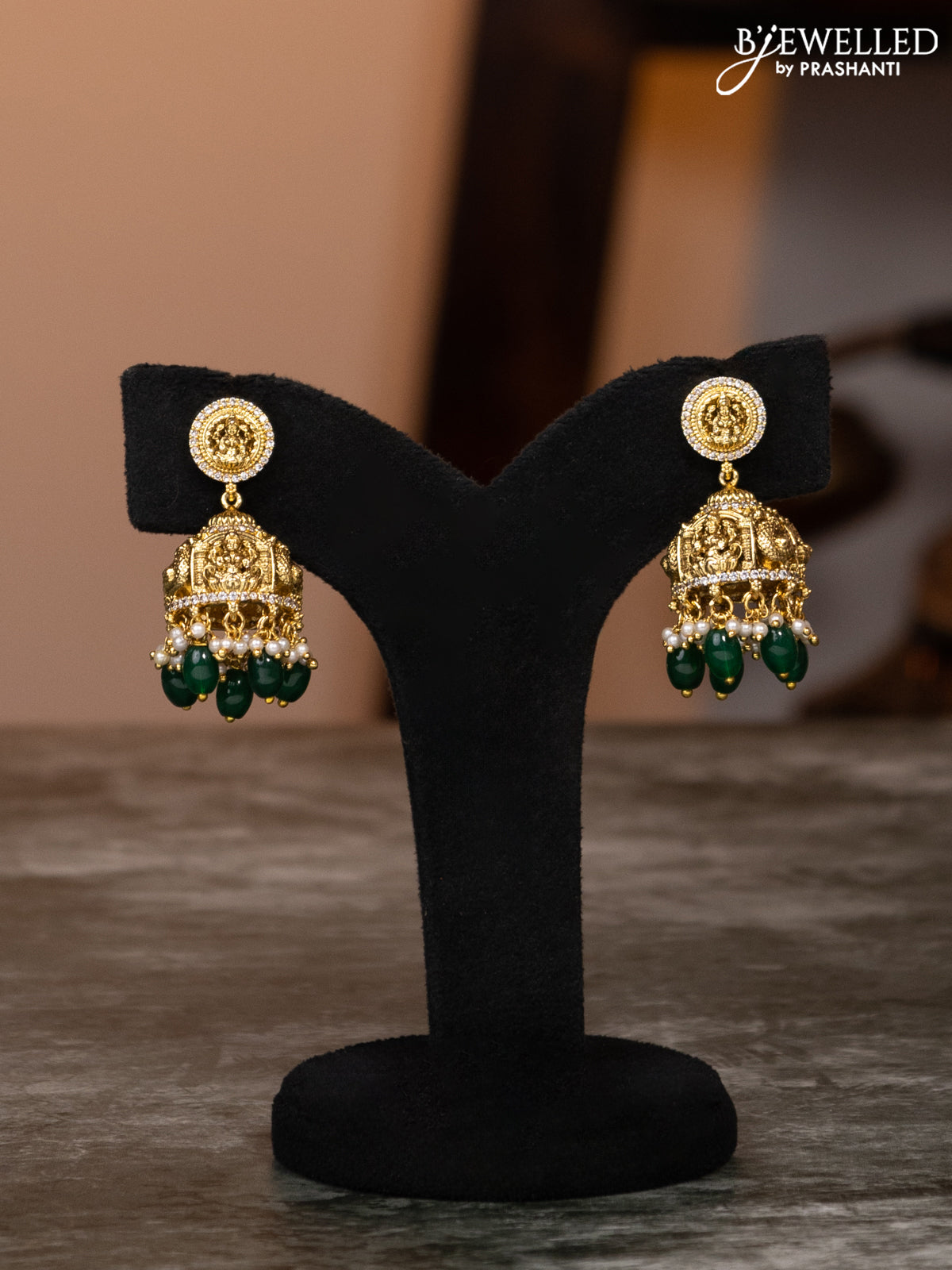 Antique haaram lakshmi design with emerald & cz stones and green beads hangings