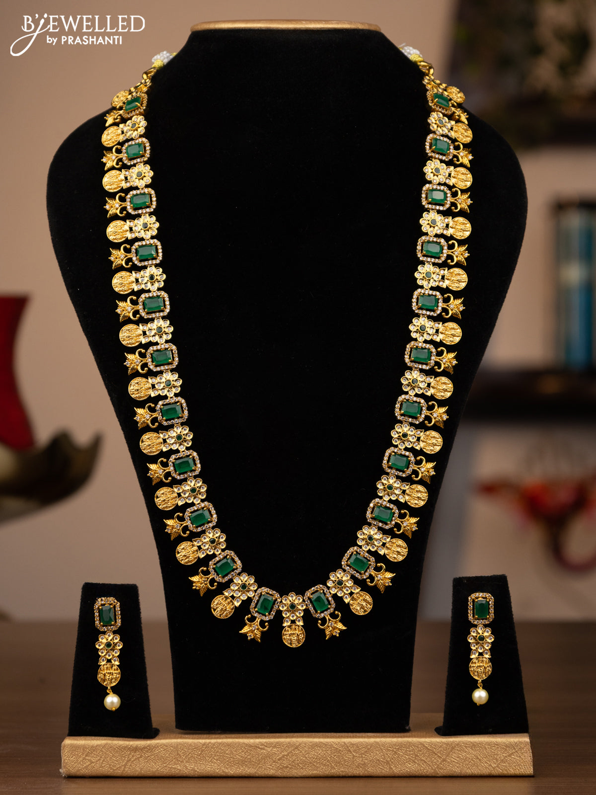 Antique haaram ram darbar design with green kemp & cz stones and pearl hangings