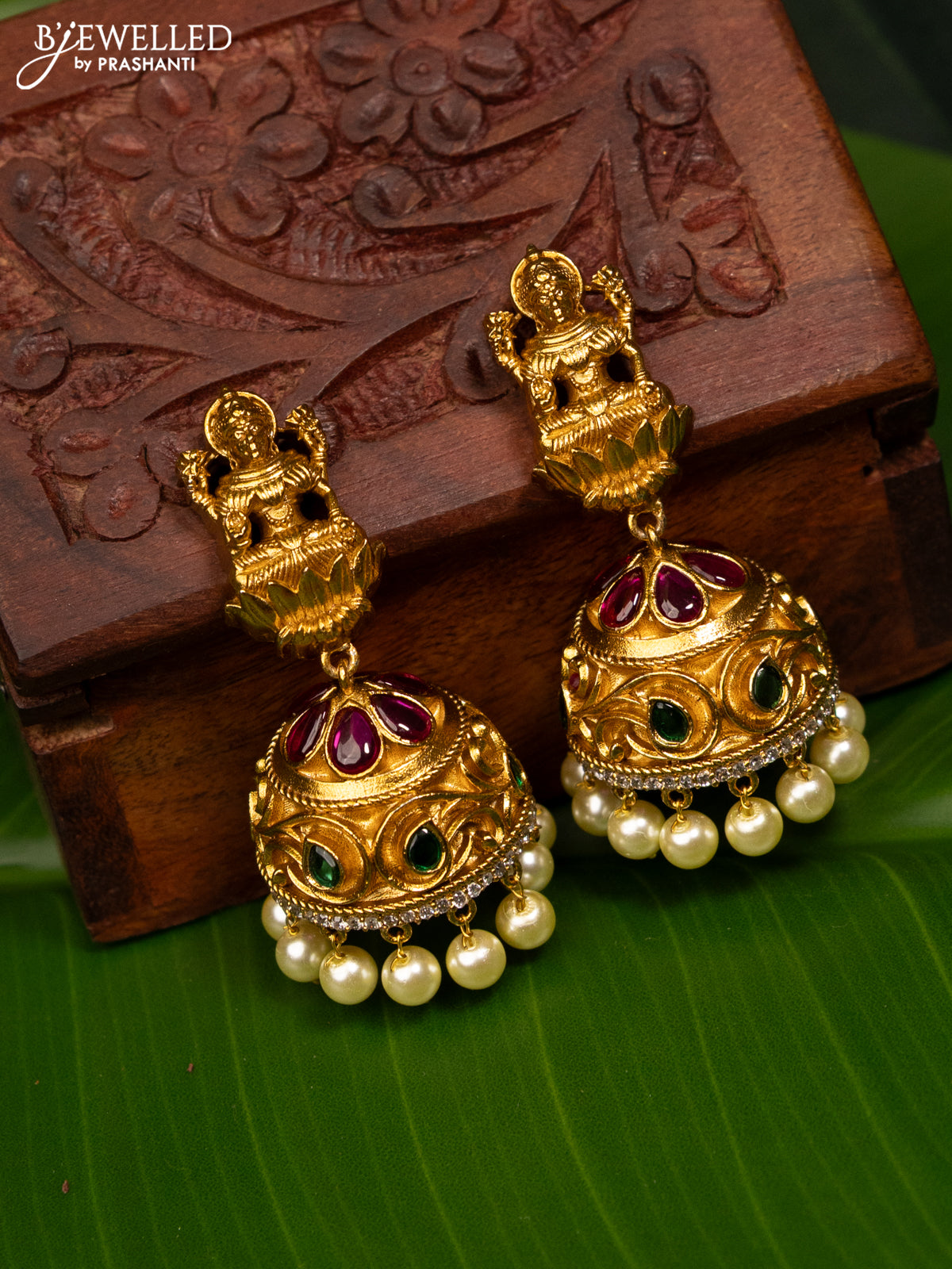 Antique jhumka lakshmi design with kemp & cz stones and pearl hangings