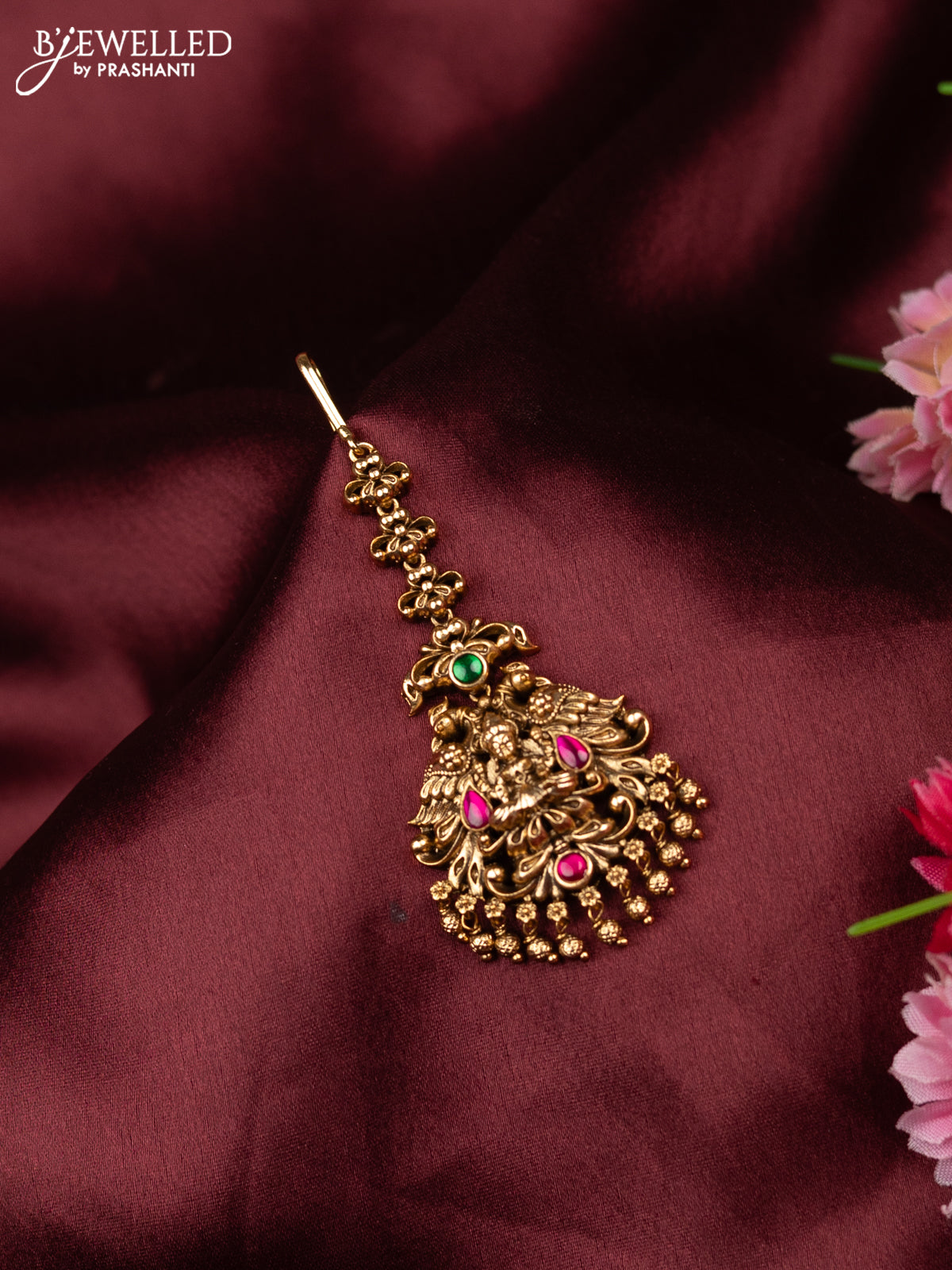 Antique maang tikka lakshmi design with kemp stones and golden beads hangings