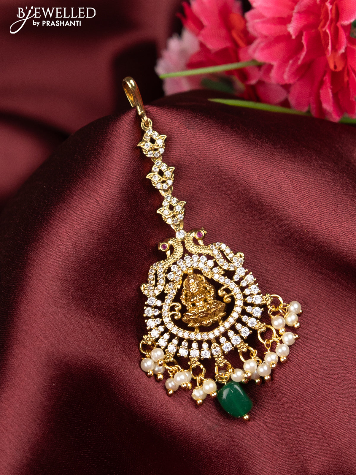 Antique maang tikka lakshmi design with pink kemp & cz stones and pearl hangings