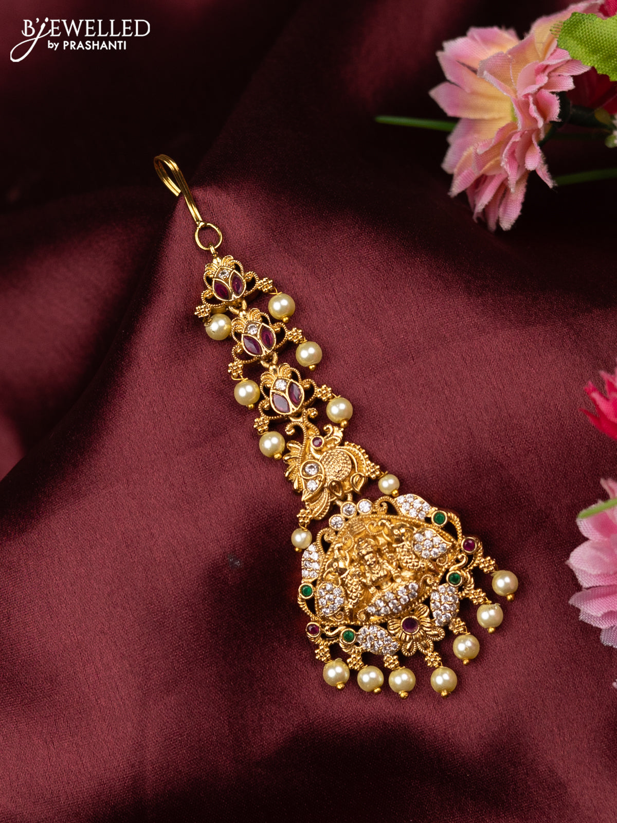 Antique maang tikka lakshmi & elephant design with kemp and cz stones and pearl hangings