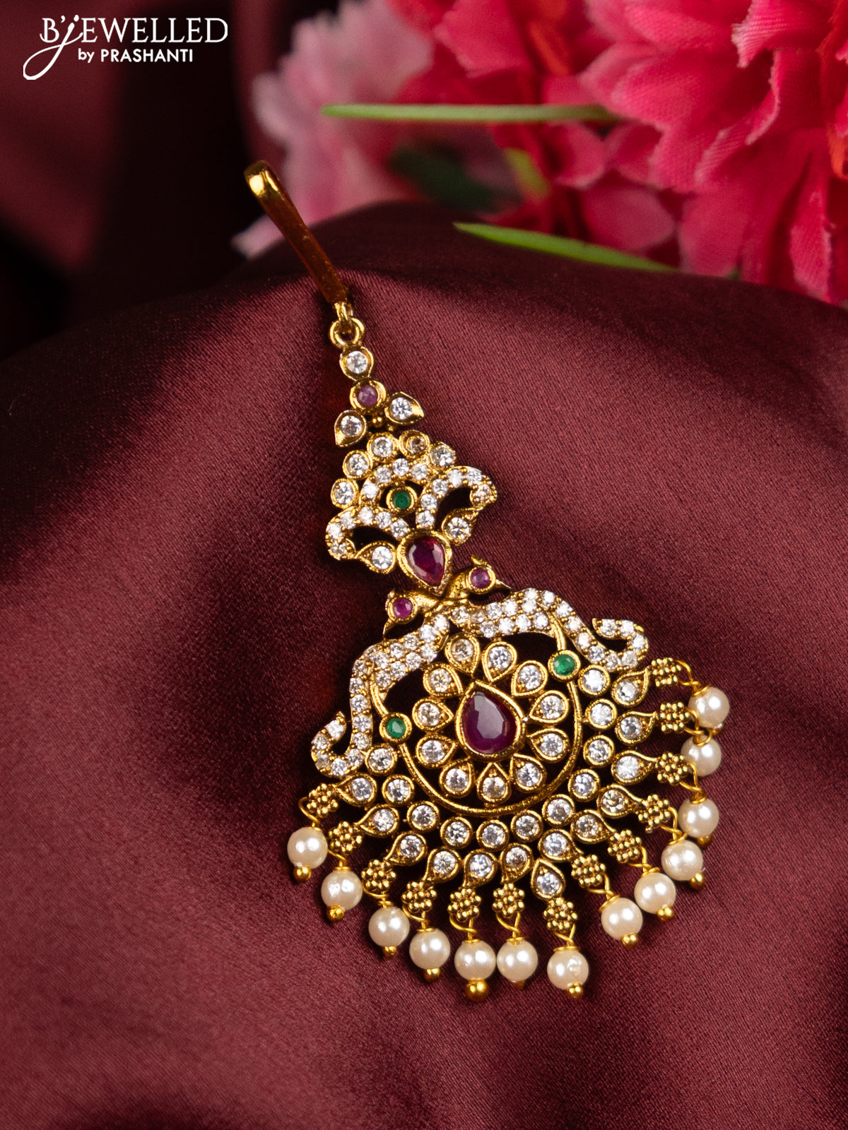 Antique maang tikka peacock design with kemp & cz stones and pearl hangings