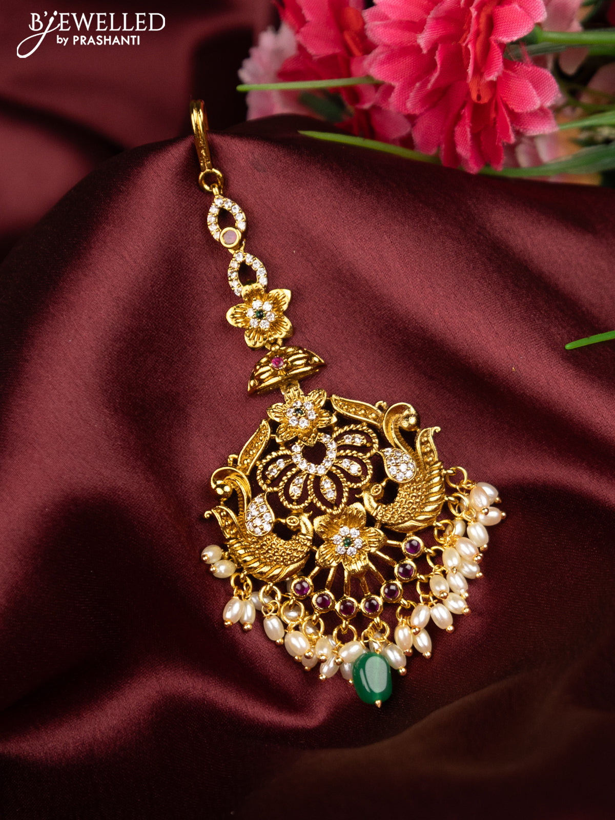Antique maang tikka peacock design with kemp & cz stones and pearl hangings