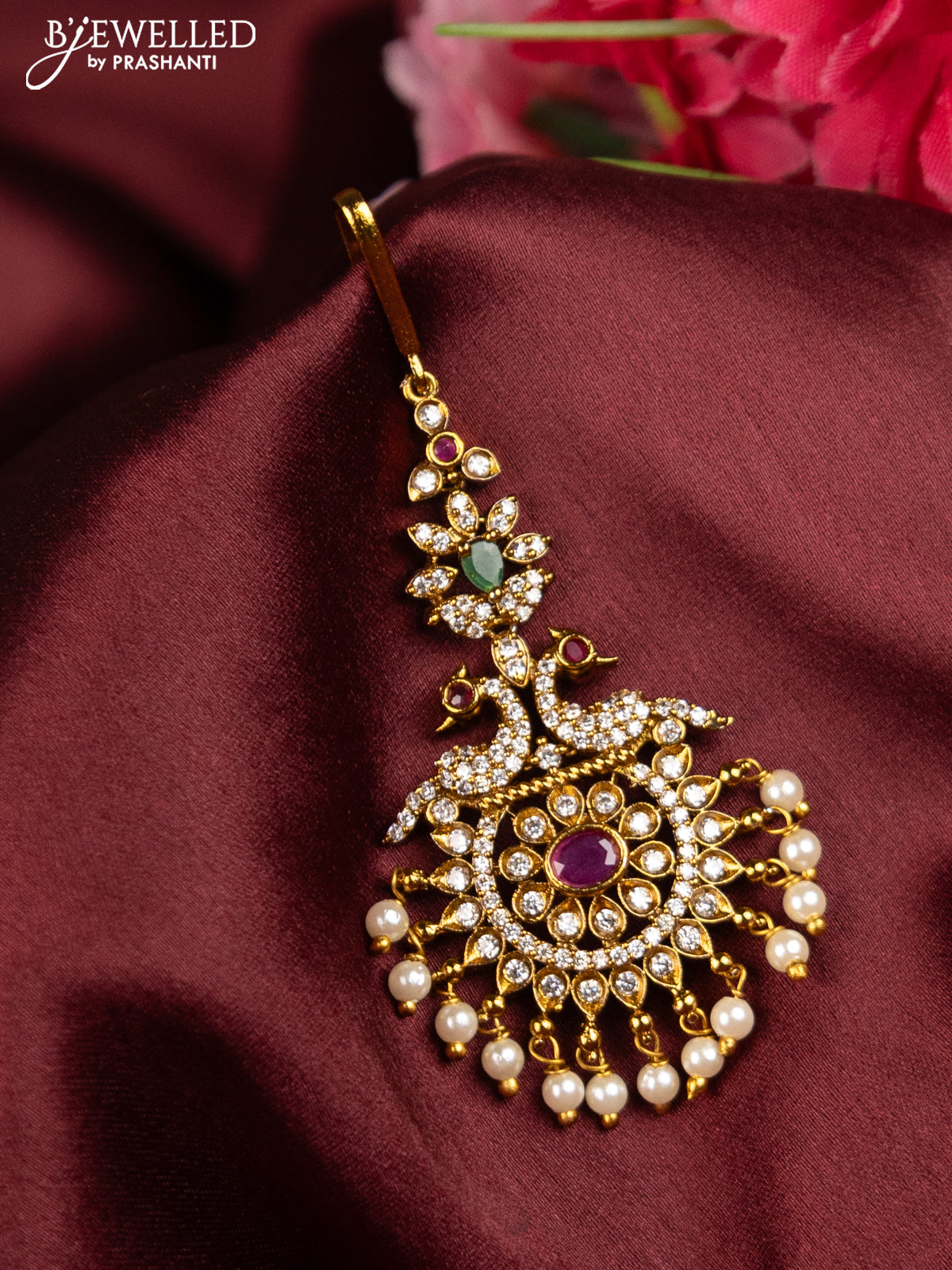 Antique maang tikka peacock design with kemp & cz stones and pearl hangings