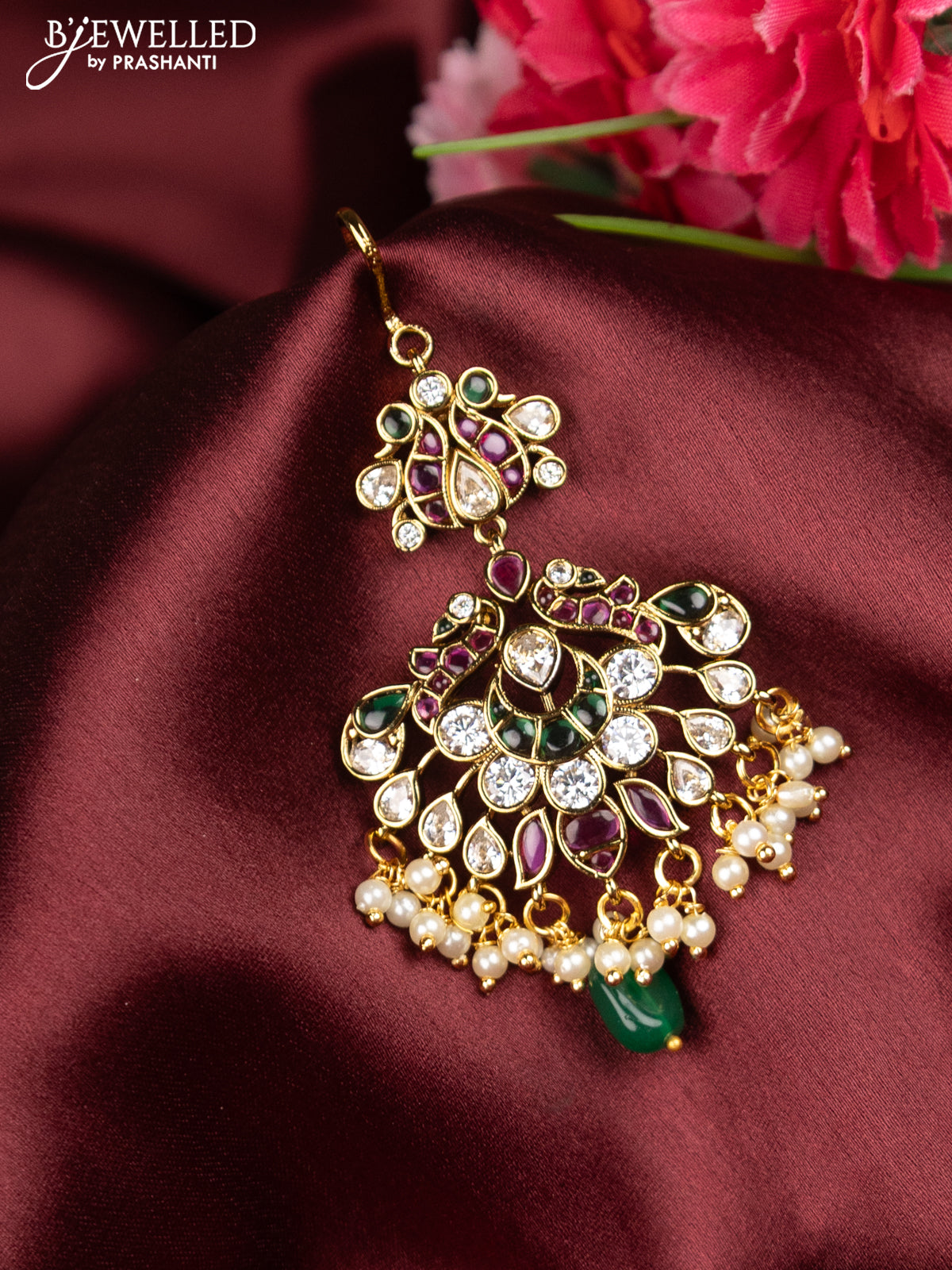 Antique maang tikka peacock design with kemp & cz stones and pearl hangings