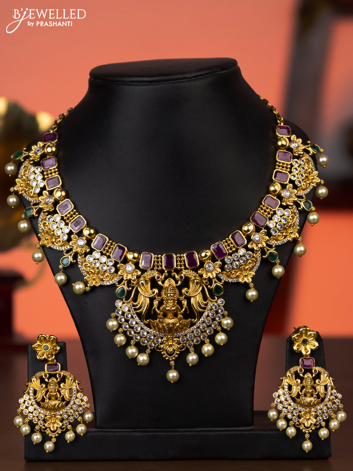 Antique necklace lakshmi design with kemp & cz stones and pearl hangings
