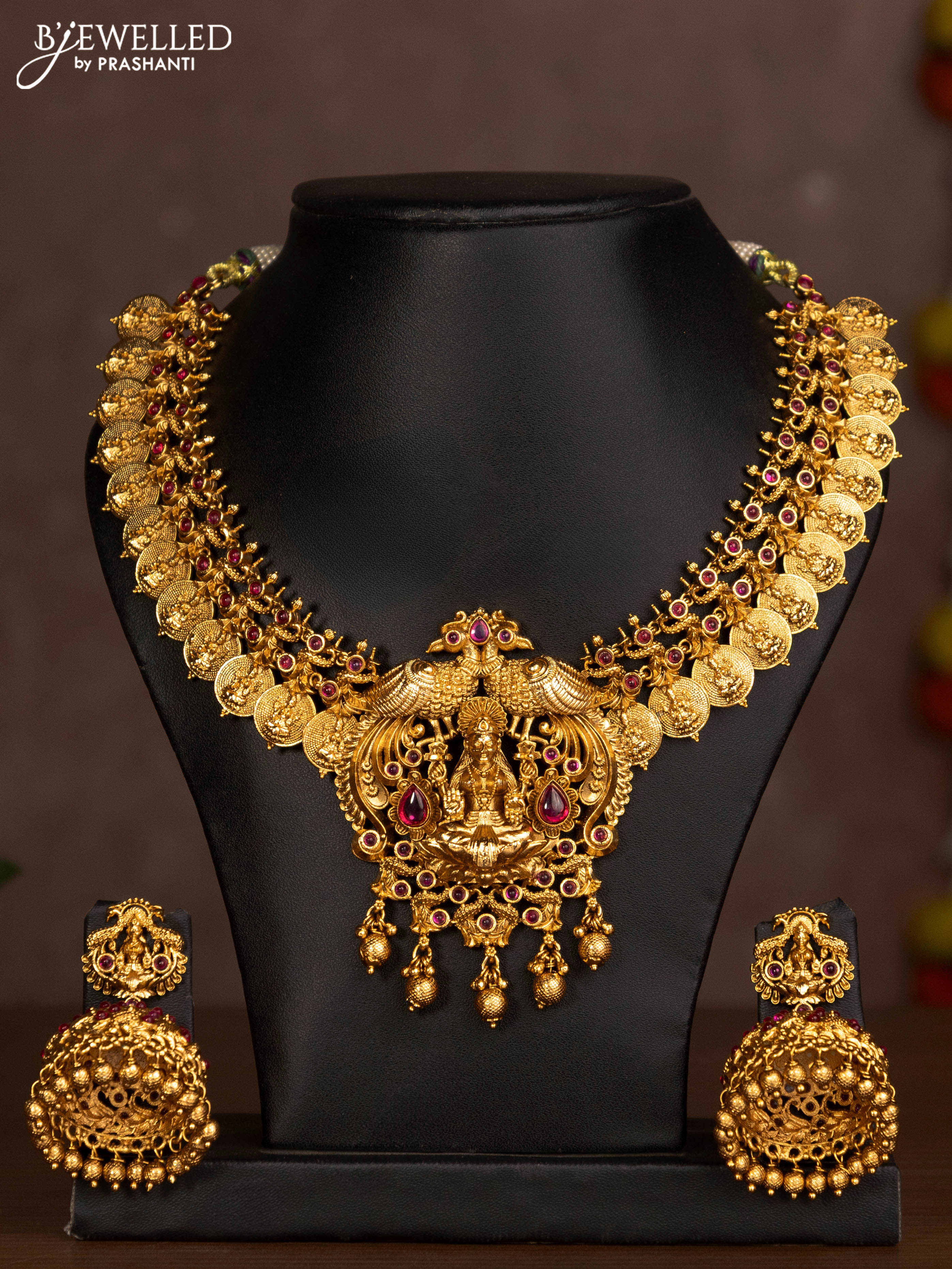 Antique necklace lakshmi kasu design with pink jadau stones and golden beads hanging
