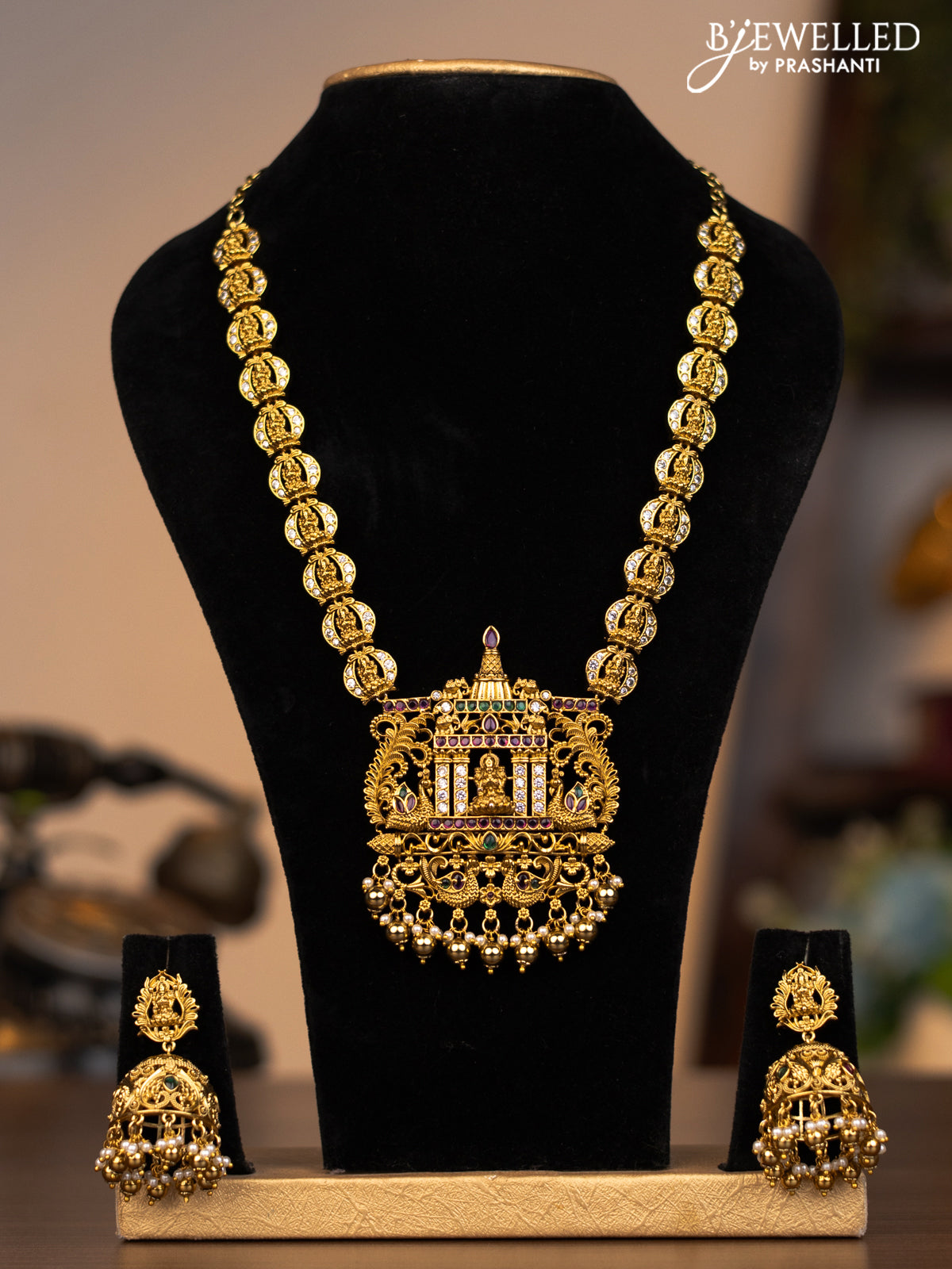 Antique necklace lakshmi pendant with kemp & cz stones and pearl & golden beads hanging