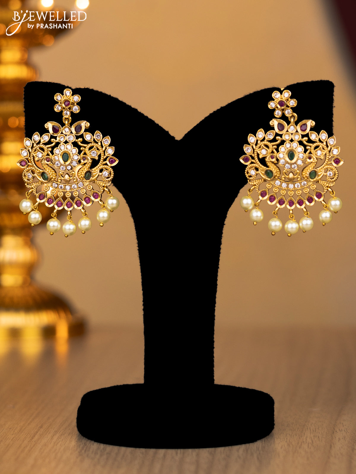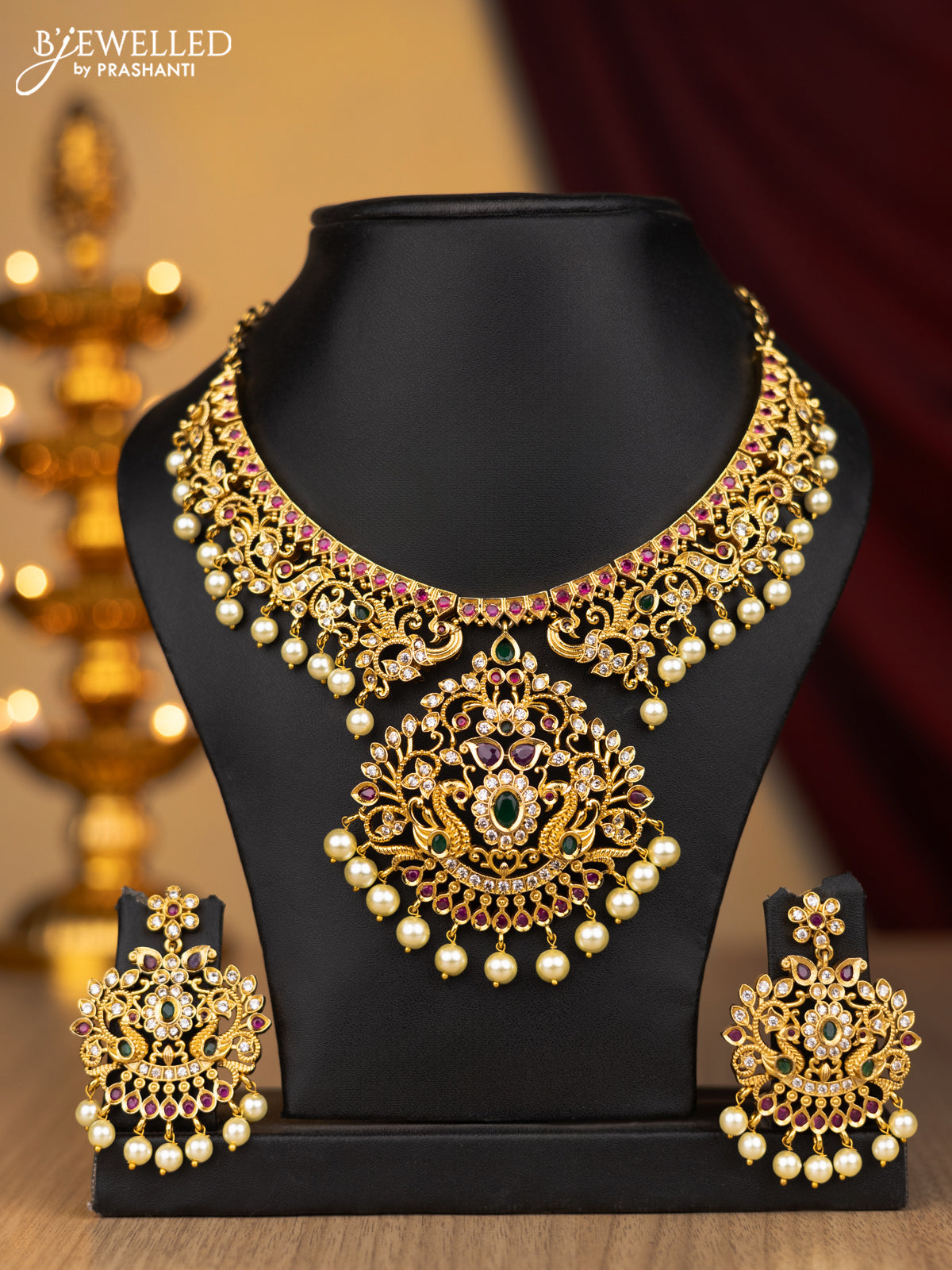 Antique necklace peacock design with kemp & cz stone and pearl hangings