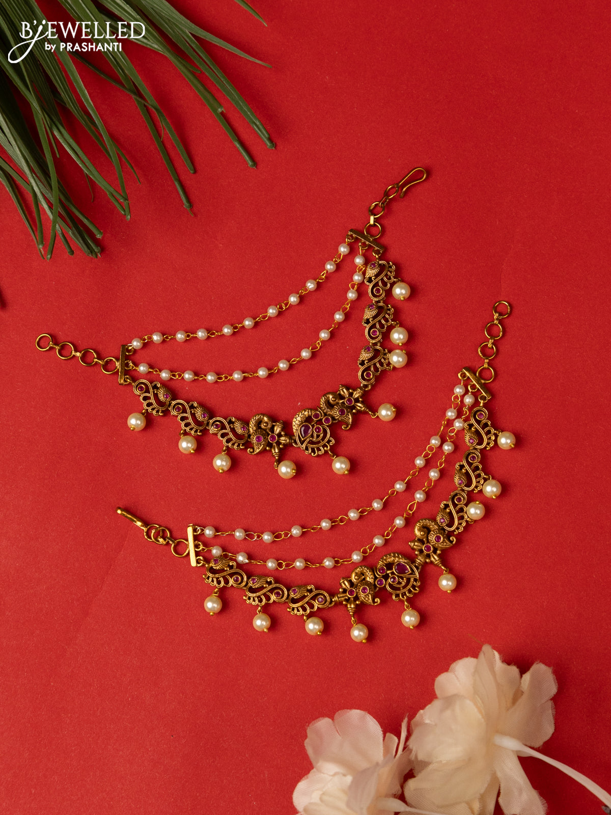 Antique triple layer mattal peacock design with pink kemp stones and pearl hangings
