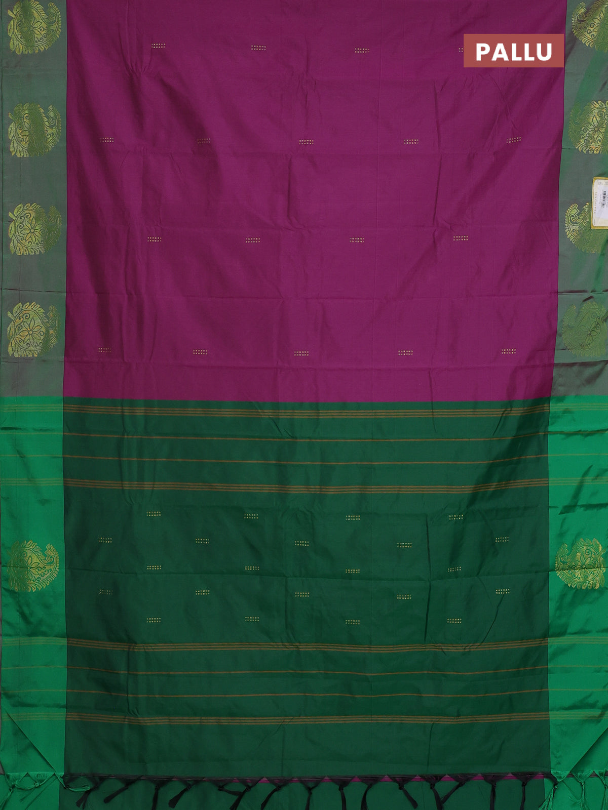 Arani semi silk saree purple and dual shade of green with zari woven buttas and paisley zari woven butta border
