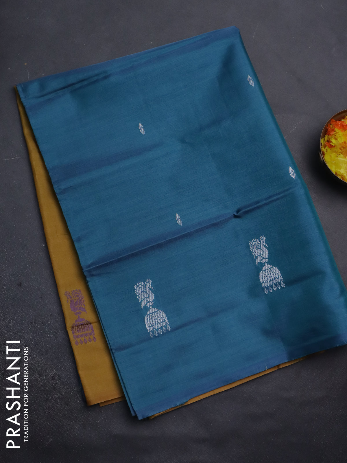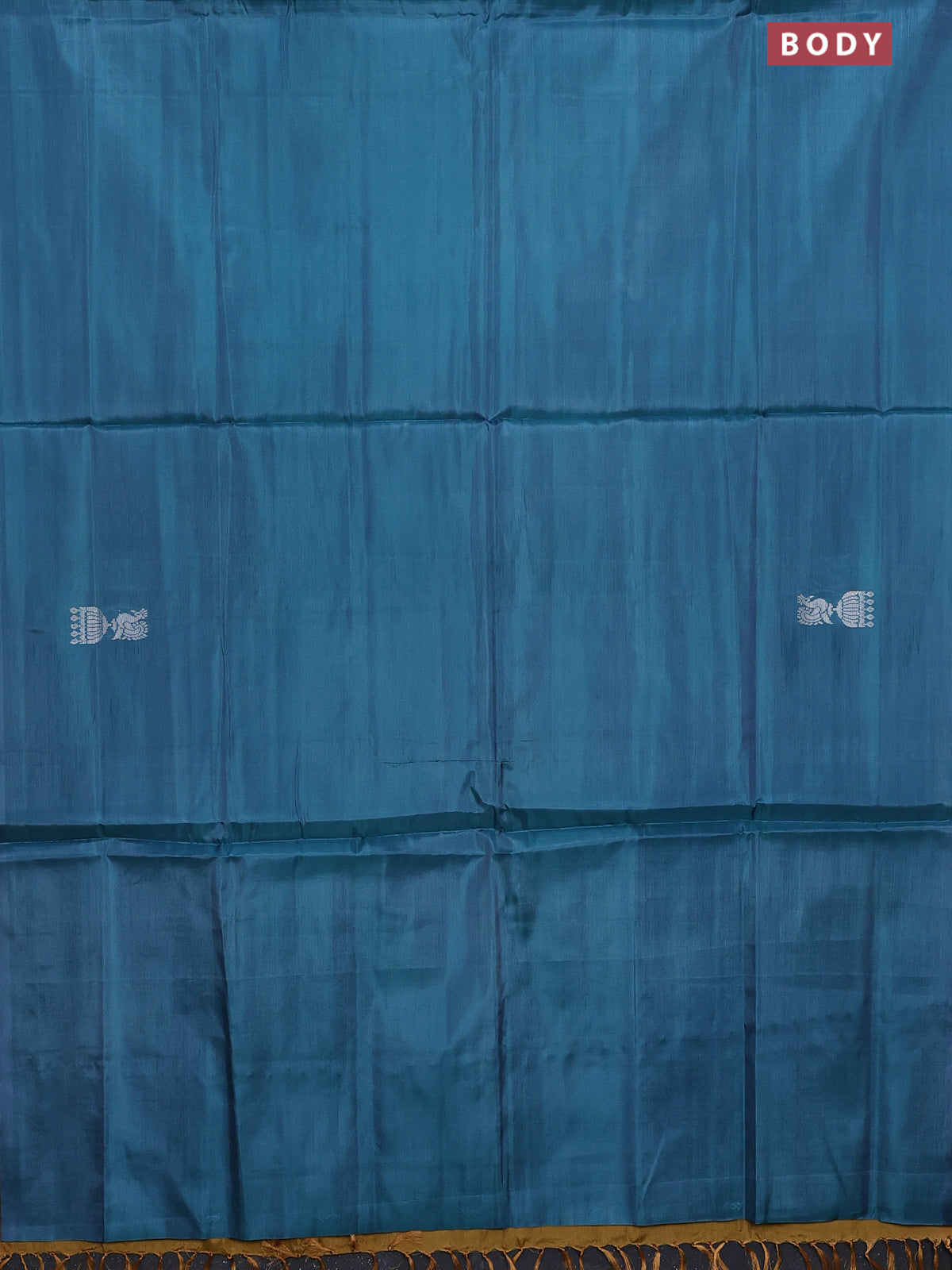 Banana pith saree teal blue and dark mustard with thread woven buttas in borderless style