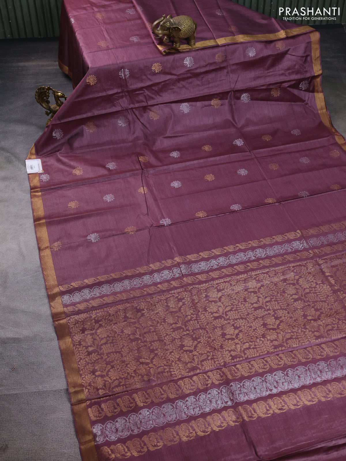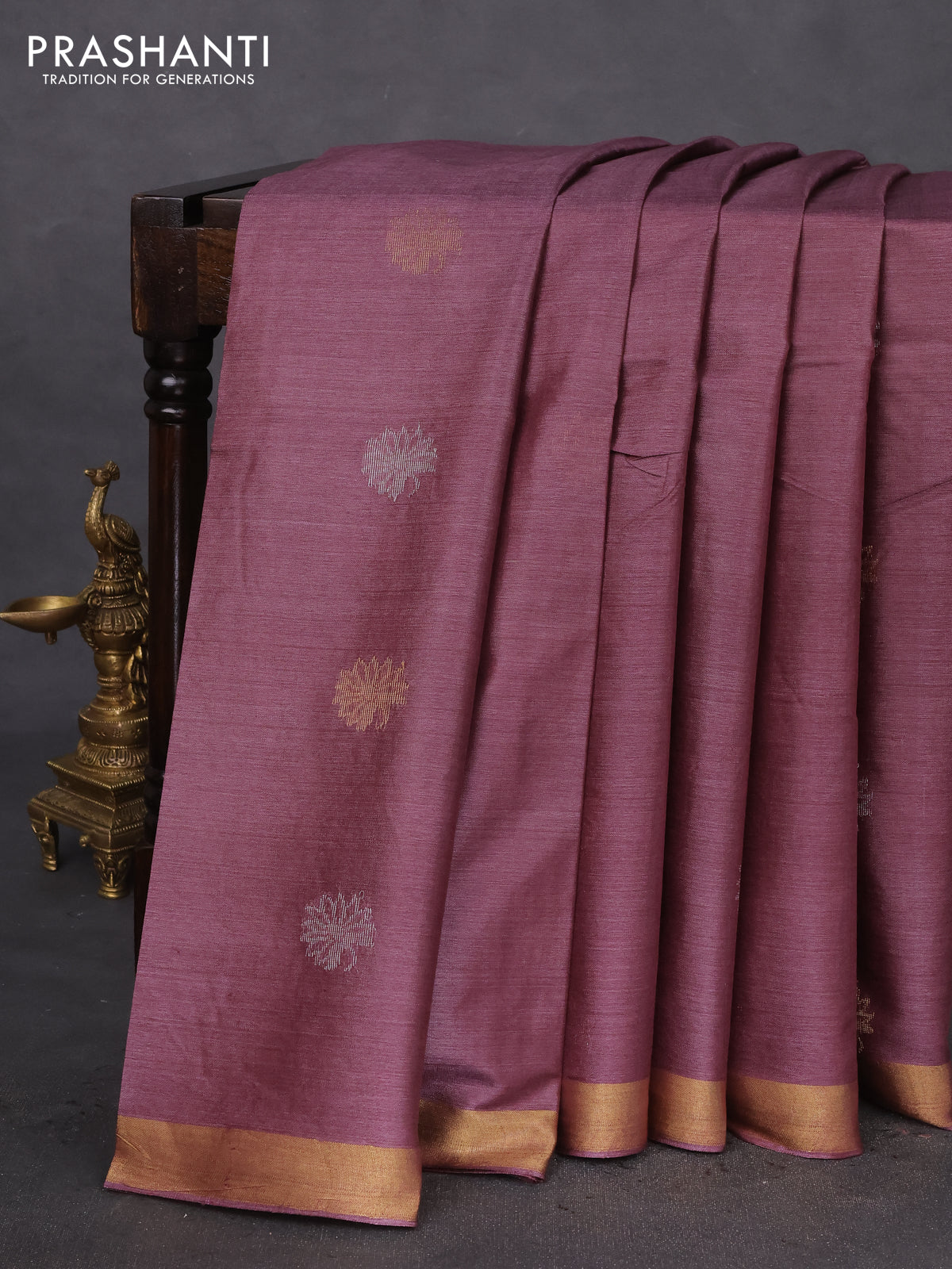 Banana silk saree wine shade with silver & gold zari woven floral buttas and zari woven border