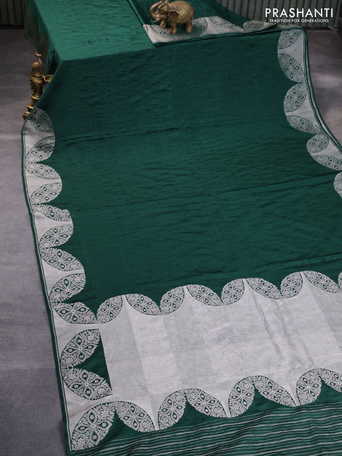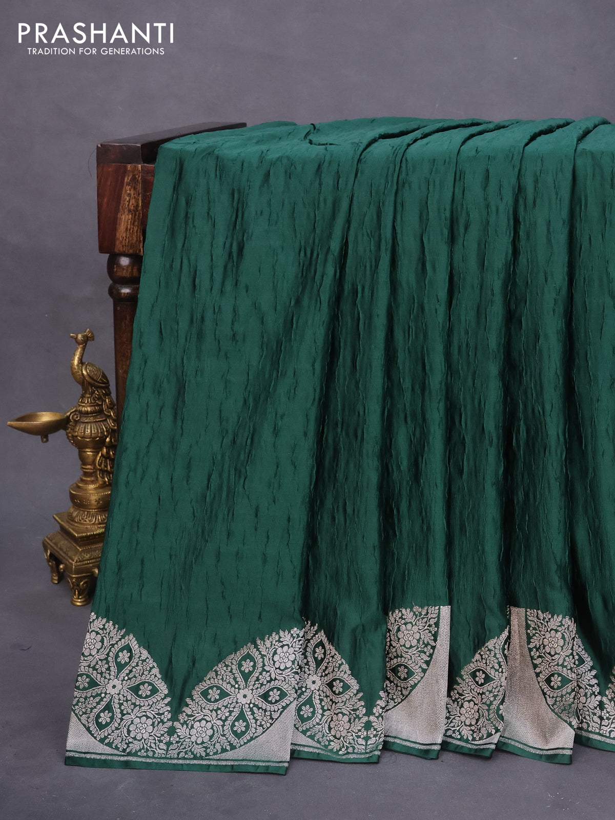Banarasi crush crepe saree dark green with plain body and zari woven border