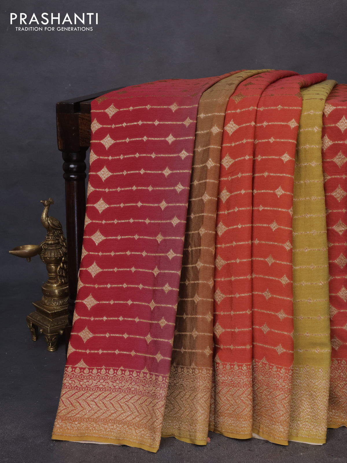 Banarasi georgette saree maroon shade and mehendi green with allover thread & zari geometric weaves and woven border
