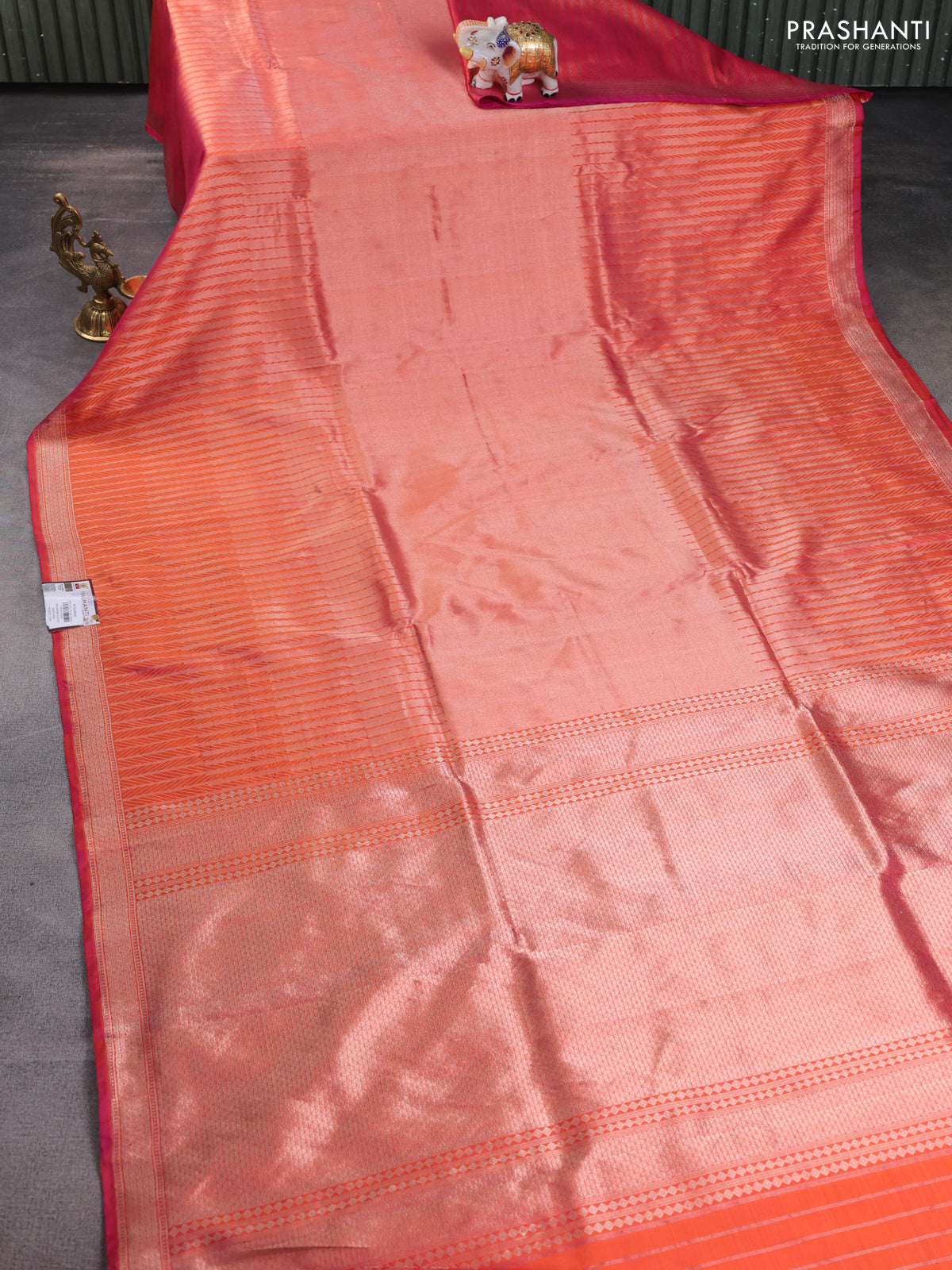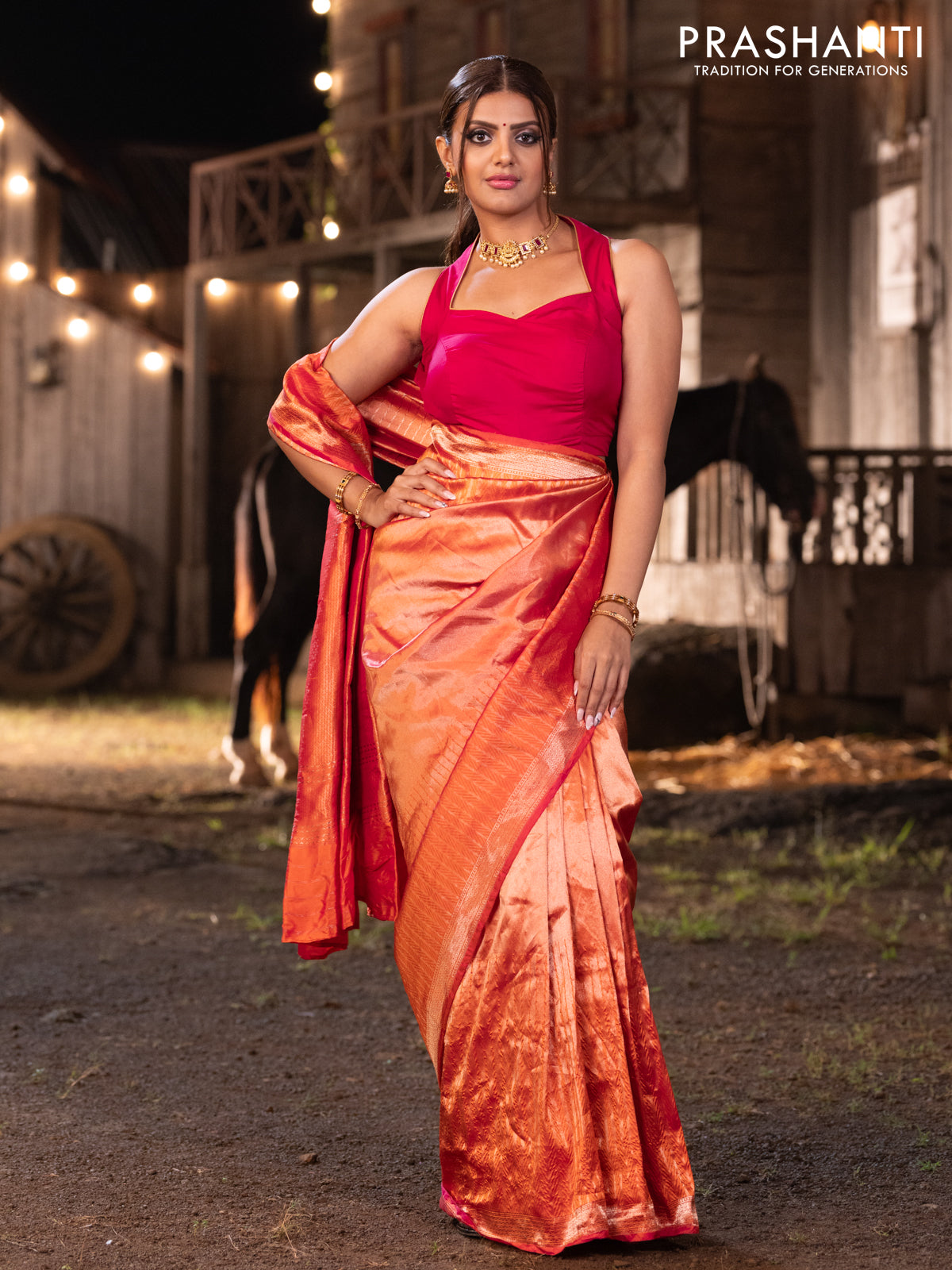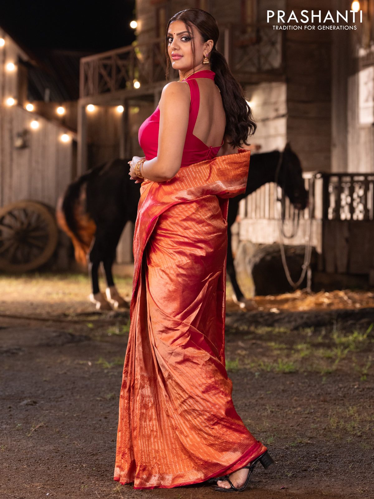 Banarasi katan tissue silk saree dual shade of orange with plain body and long temple design zari woven border