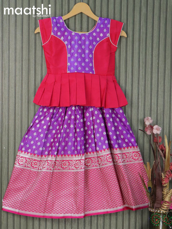 Banarasi kids lehanga blue and pink shade with patch work neck pattern and allover zari buttas & zari woven border for 13 years