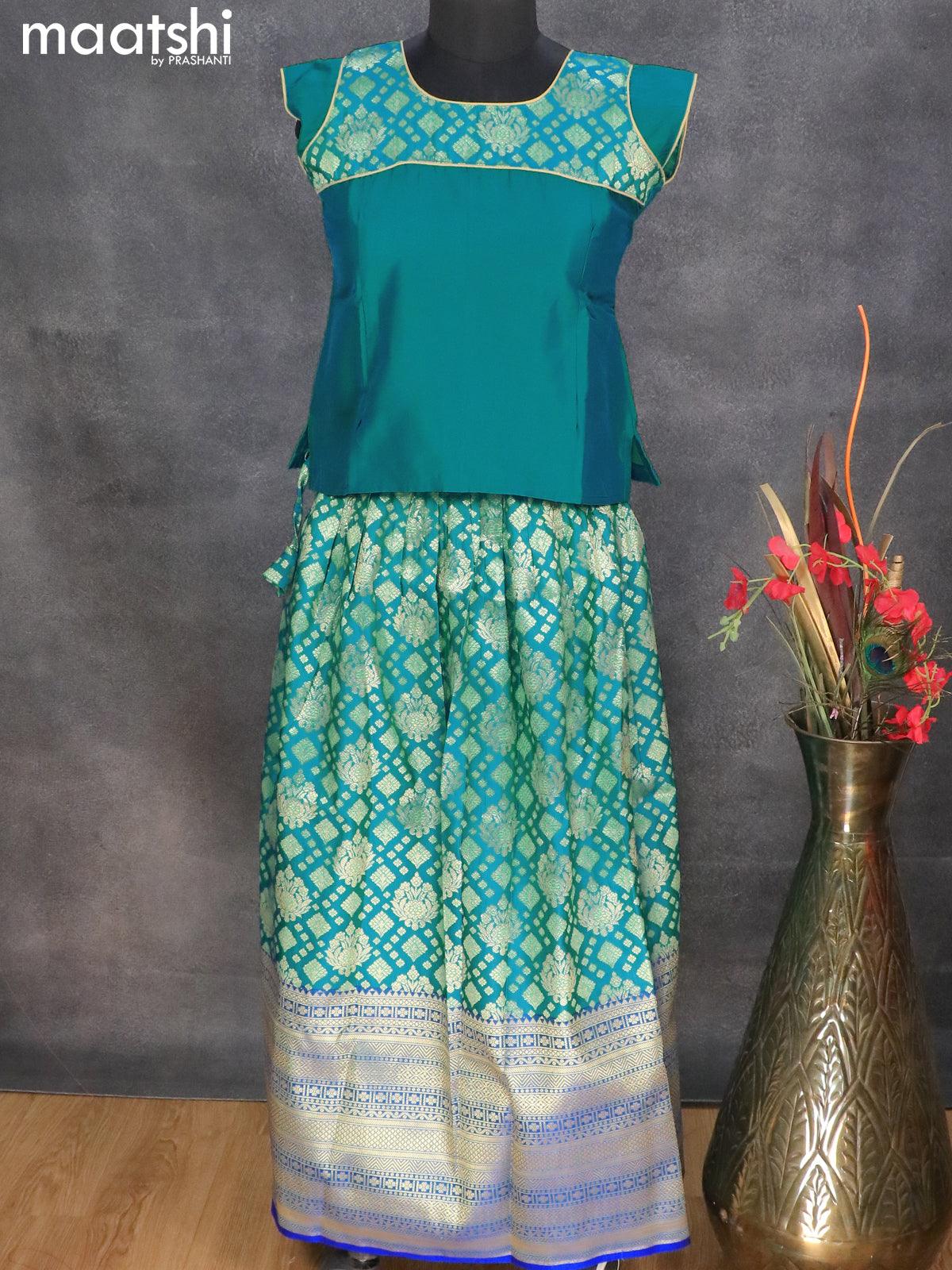 Banarasi kids lehanga dual shade of teal blue and blue with patch work neck pattern and allover silver zari buttas & long zari woven border for 11 years