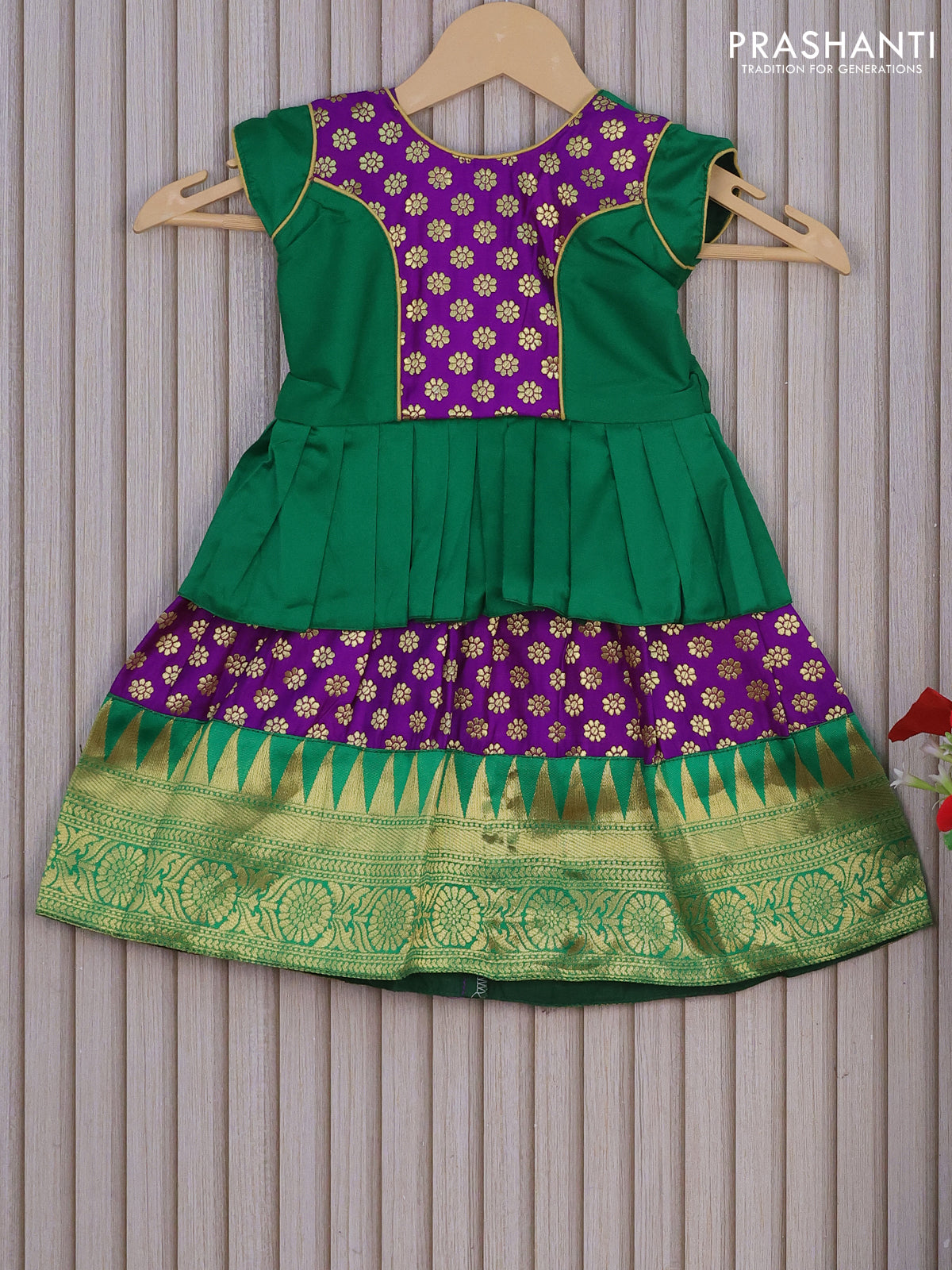Banarasi kids lehenga green and purple with patch work neck pattern and zari buttas & zari woven border