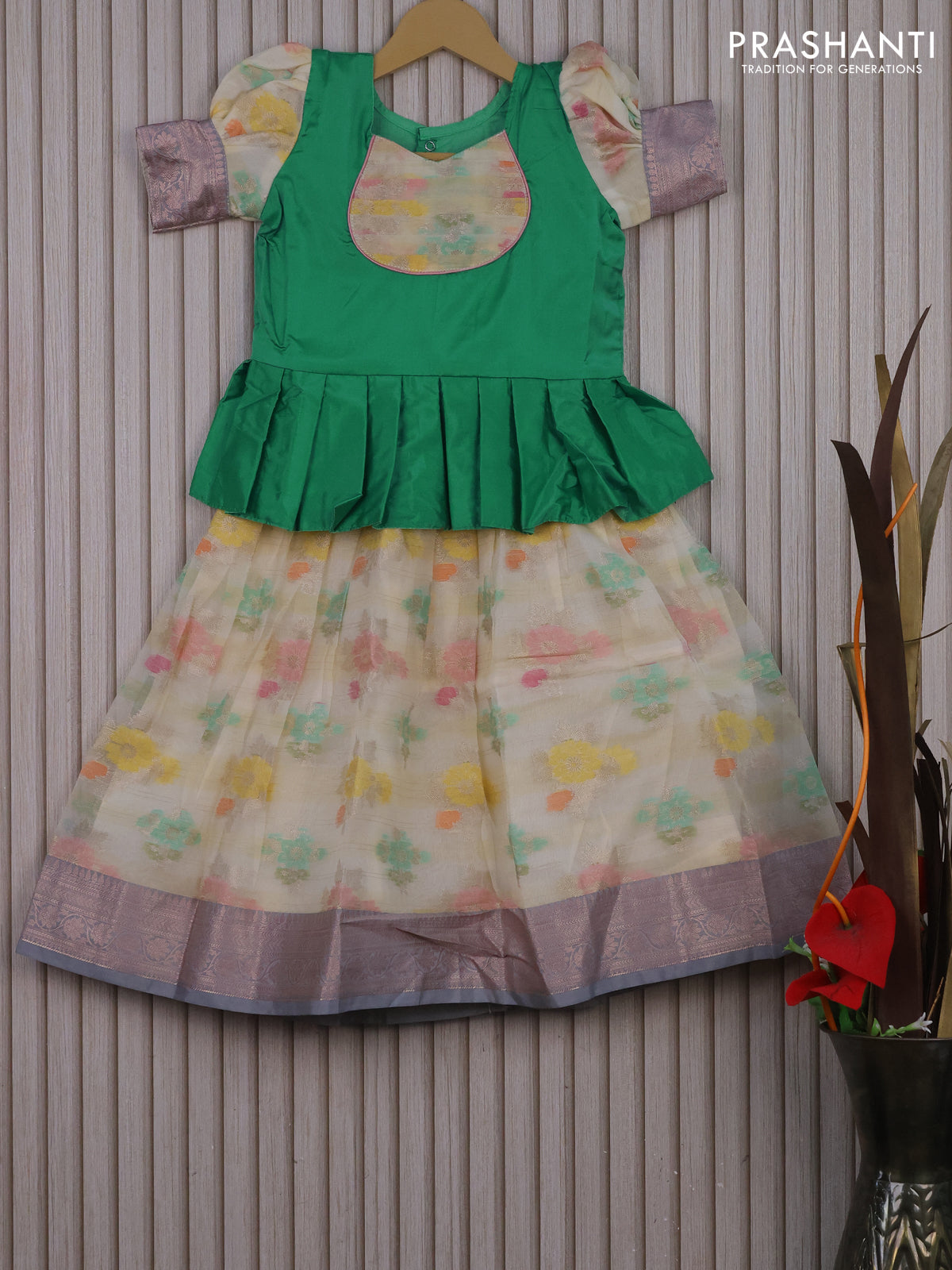Banarasi kids lehenga teal green and off white & grey with patch work neck pattern with thread zari weaves & zari woven border
